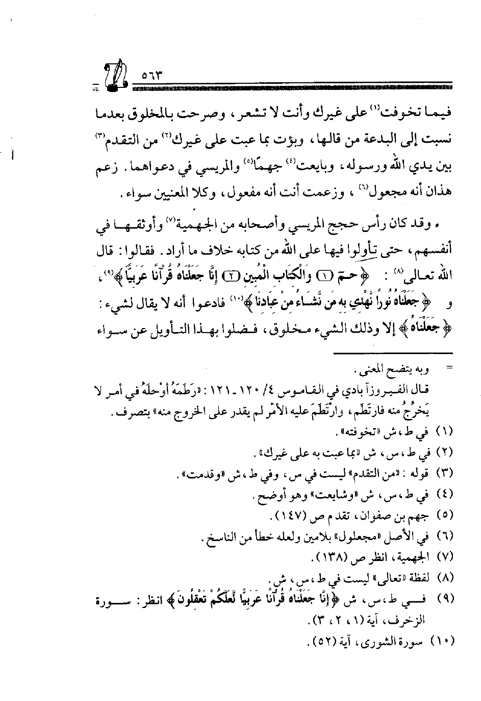 وَقَدْ كَانَ رَأْسُ حُجَجِ الْمَرِيسِيِّ وَأَصْحَابِهِ مِنَ الْجَهْمِيَّةِ7 وَأَوْثَقُهَا فِي أَنْفُسِهِمْ، حَتَّى تَأَوَّلُوا فِيهَا عَلَى اللَّهِ مِنْ كِتَابِهِ خِلَافَ مَا أَرَادَ. فَقَالُوا: قَالَ اللَّهُ تَعَالَى8: {حم وَالْكِتَابِ الْمُبِينِ، إِنَّا جَعَلْنَاهُ قُرْآنًا عَرَبِيًّا لَعَلَّكُمْ تَعْقِلُونَ} 9 وَ {جَعَلْنَاهُ نُورًا نَهْدِي بِهِ مَنْ نَشَاءُ مِنْ عِبَادِنَا} 10 فَادَّعَوْا أَنَّهُ لَا يُقَالُ لِشَيْءٍ: {جَعَلْنَاه} إِلَّا وَذَلِكَ الشَّيْءُ مَخْلُوقٌ، فَضَلُّوا بِهَذَا التَّأْوِيل عَن سَوَاء
