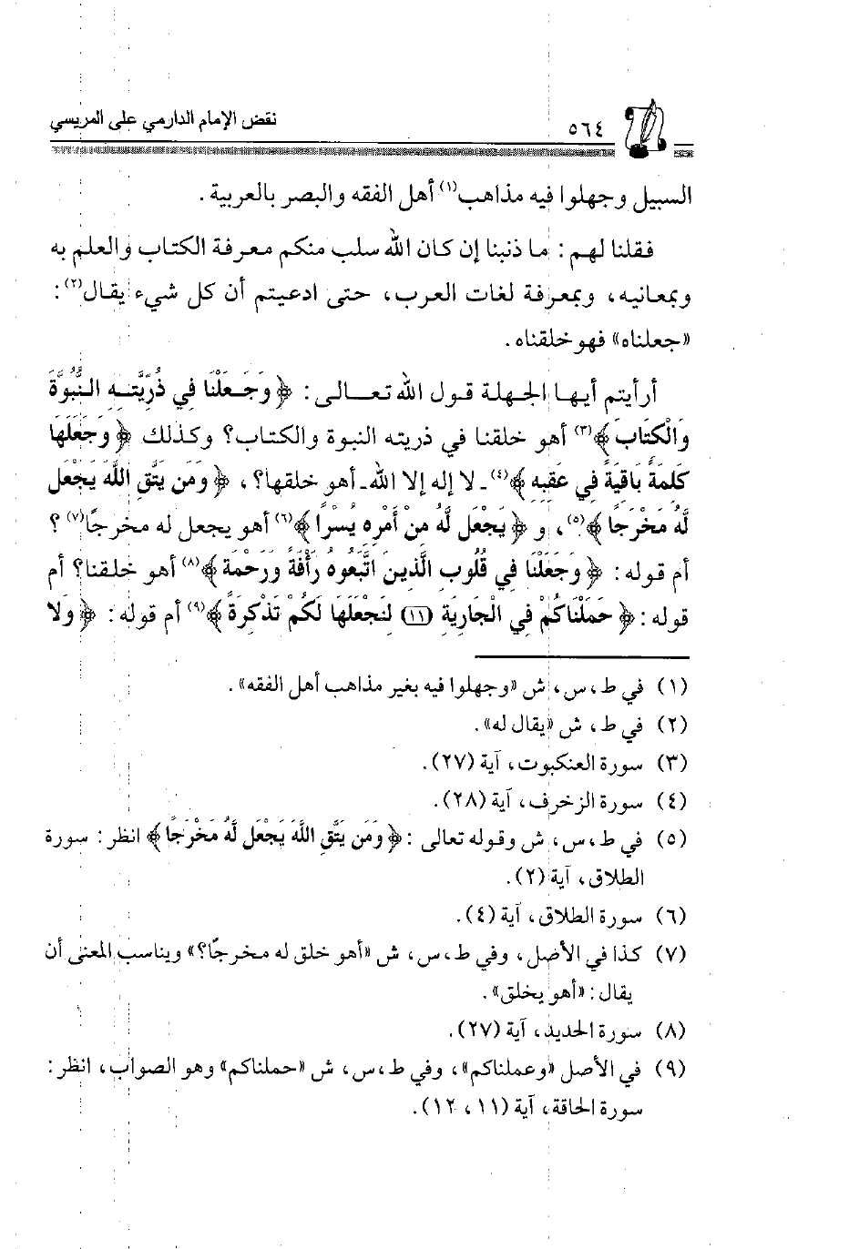 أَرَأَيْتُمْ أَيُّهَا الْجَهَلَةُ قَوْلَ اللَّهِ تَعَالَى: {وَجَعَلْنَا فِي ذُرِّيَّتِهِمَا النُّبُوَّةَ وَالْكِتَابَ} 3 أَهُوَ خَلَقْنَا فِي ذُرِّيَّتِهِ النُّبُوَّةَ وَالْكِتَابَ؟ وَكَذَلِكَ: {وَجَعَلَهَا كَلِمَةً بَاقِيَةً فِي عَقِبِهِ} 4 -لَا إِلَهَ إِلَّا اللَّهُ- أَهُوَ خَلَقَهَا؟، {وَمَنْ يَتَّقِ اللَّهَ يَجْعَلْ لَهُ مَخْرَجًا} 5، وَ {يَجْعَلْ لَهُ مِنْ أَمْرِهِ يُسْرًا} 6 أَهُوَ يَجْعَلُ لَهُ مَخْرَجًا7؟ أَمْ قَوْلُهُ: {وَجَعَلْنَا فِي قُلُوبِ الَّذِينَ اتَّبَعُوهُ رَأْفَةً وَرَحْمَة} 8 أَهُوَ خَلَقْنَا؟ أَمْ قَوْلُهُ: {حَمَلْنَاكُمْ فِي الْجَارِيَةِ، لِنَجْعَلَهَا لَكُمْ تَذْكِرَة} 9 أم قَوْله: {وَلَا