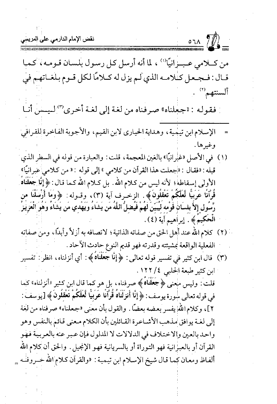 1 فِي الأَصْل "غبرانيًّا" بالغين الْمُعْجَمَة، قلت: والعبارة من قَوْله فِي السطر الَّذِي قلبه "فَقَالَ: "جعلت هَذَا الْقُرْآن من كَلَامي" إِلَى قَوْله: "من كلامى عبرانيًّا" الأولى إِسْقَاطه؛ لِأَنَّهُ لَيْسَ من كَلَام الله. بل كَلَام الله كَمَا قَالَ: {إِنَّا جَعَلْنَاهُ قُرْآنًا عَرَبِيًّا لَعَلَّكُمْ تَعْقِلُون} [الزخرف آيَة 3] ، وَقَوله: {وَمَا أَرْسَلْنَا مِنْ رَسُولٍ إِلاَّ بِلِسَانِ قَوْمِهِ لِيُبَيِّنَ لَهُمْ فَيُضِلُّ اللَّهُ مَنْ يَشَاءُ وَيَهْدِي مَنْ يَشَاءُ وَهُوَ الْعَزِيزُ الْحَكِيم} . [إِبْرَاهِيم آيَة 4] .