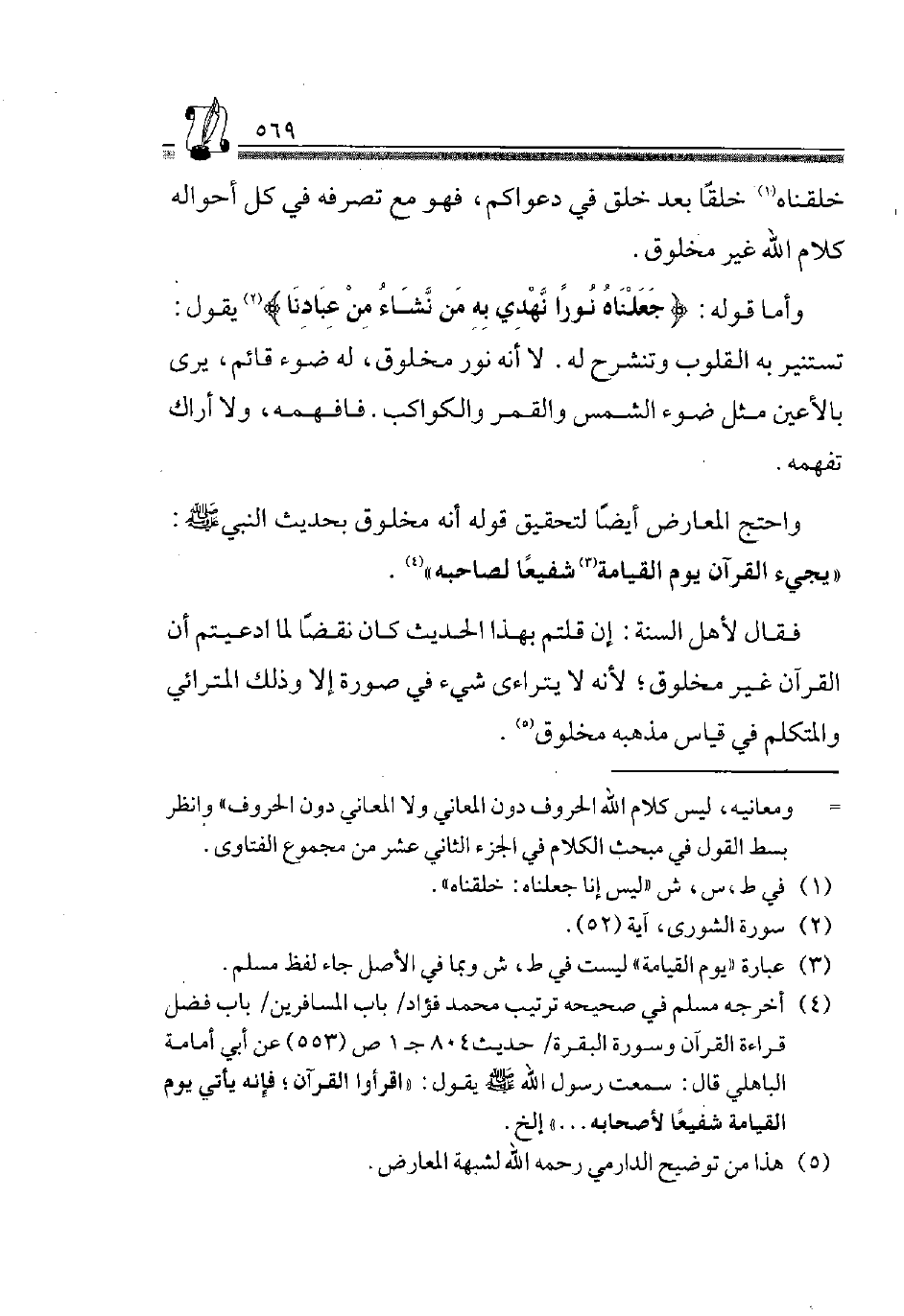 وَاحْتَجَّ الْمُعَارِضُ أَيْضًا لِتَحْقِيقِ قَوْلِهِ أَنَّهُ مَخْلُوقٌ بِحَدِيثِ النَّبِيِّ صَلَّى اللَّهُ عيله وَسَلَّمَ: "يَجِيءُ الْقُرْآنُ يَوْمَ الْقِيَامَةِ 3 شَفِيعًا لِصَاحِبِهِ" 4.