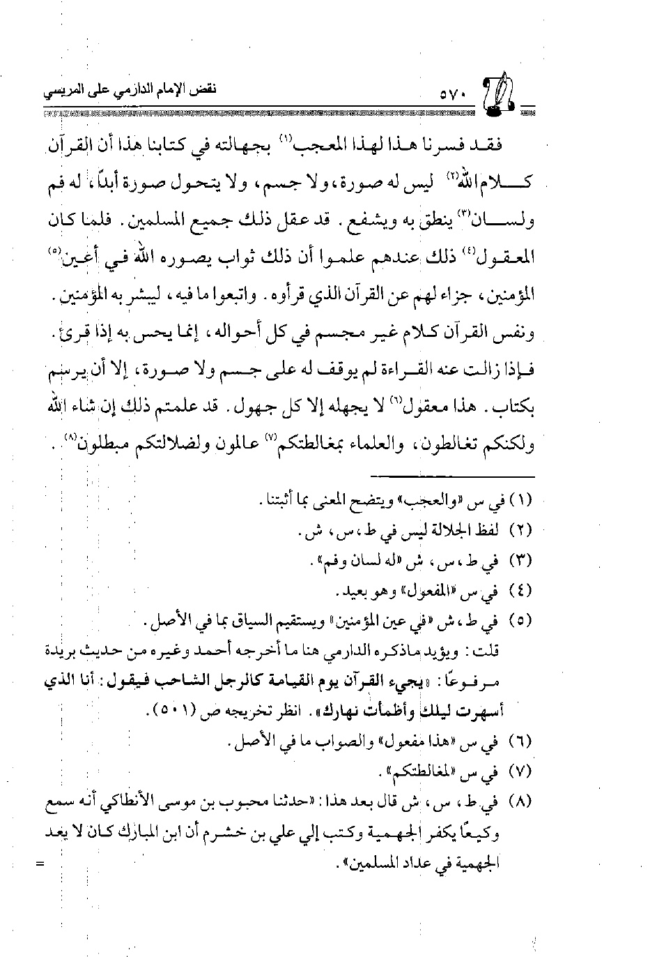 فَقَدْ فَسَّرْنَا هَذَا لِهَذَا الْمُعْجَبِ1 بِجَهَالَتِهِ فِي كِتَابِنَا هَذَا أَنَّ الْقُرْآنَ كَلَامُ اللَّهِ2 لَيْسَ لَهُ صُورَةٌ، وَلَا جِسْمٌ، وَلَا يَتَحَوَّلُ صُورَةً أَبَدًا، لَهُ فَمٌ وَلِسَانٌ3 ينْطق بِهِ ويشفع. فقد عَقِلَ ذَلِكَ جَمِيعُ الْمُسْلِمِينَ. فَلَمَّا كَانَ الْمَعْقُولُ4 ذَلِكَ عِنْدَهُمْ عَلِمُوا أَنَّ ذَلِكَ ثَوَابٌ يُصَوِّرُهُ اللَّهُ فِي أَعْيُنِ5 الْمُؤْمِنِينَ، جَزَاءً لَهُمْ عَن الْقُرْآن الَّذِي قرأوه. وَاتَّبَعُوا مَا فِيهِ، لِيُبَشِّرَ بِهِ الْمُؤْمِنِينَ وَنَفْسُ الْقُرْآنِ كَلَامٌ غَيْرُ مجسم فِي كل أَحْوَاله، إِنَّمَا يحسن بِهِ إِذا قرئَ. فَإِذا زَالَت عَنهُ الْقِرَاءَة لم يُوقف لَهُ على جسم وَلَا صُورَةٍ، إِلَّا أَنْ يُرْسَمَ بِكِتَابٍ. هَذَا مَعْقُولٌ6 لَا يَجْهَلُهُ إِلَّا كُلُّ جَهُولٍ. قَدْ عَلِمْتُمْ ذَلِكَ إِنْ شَاءَ اللَّهُ وَلَكِنَّكُمْ تُغَالِطُونَ، وَالْعُلَمَاءُ بِمُغَالَطَتِكُمْ7 عَالِمُونَ وَلِضَلَالَتِكُمْ مُبْطِلُونَ8. وَيَكْفِي الْعَاقِلَ9 أَقَلُّ مِمَّا بَينا وشرحنا عَن مذاهبكم غَيْرَ أَنَّ فِي تَكْرِيرِ الْبَيَانِ شِفَاء لم فِي الصُّدُور.