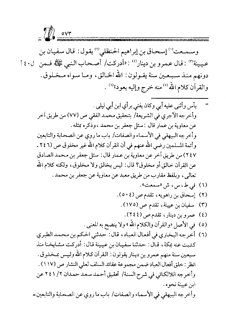 وَسَمِعْتُ1 إِسْحَاقَ بْنَ إِبْرَاهِيمَ الْحَنْظَلِيَّ2 يَقُولُ: قَالَ سُفْيَانُ بْنُ عُيَيْنَةَ3: قَالَ عَمْرُو بْنُ دِينَارٍ4: "أَدْرَكْتُ، أَصْحَابِ النَّبِيِّ صَلَّى اللَّهُ عَلَيْهِ وَسَلَّمَ فَمَنْ دُونَهُمْ مُنْذُ سَبْعِينَ سَنَةً يَقُولُونَ: اللَّهُ الْخَالِقُ، وَمَا سِوَاهُ مَخْلُوقٌ وَالْقُرْآنُ كَلَامُ اللَّهِ5 مِنْهُ خرج وَإِلَيْهِ يعود"6. ل 40 أ