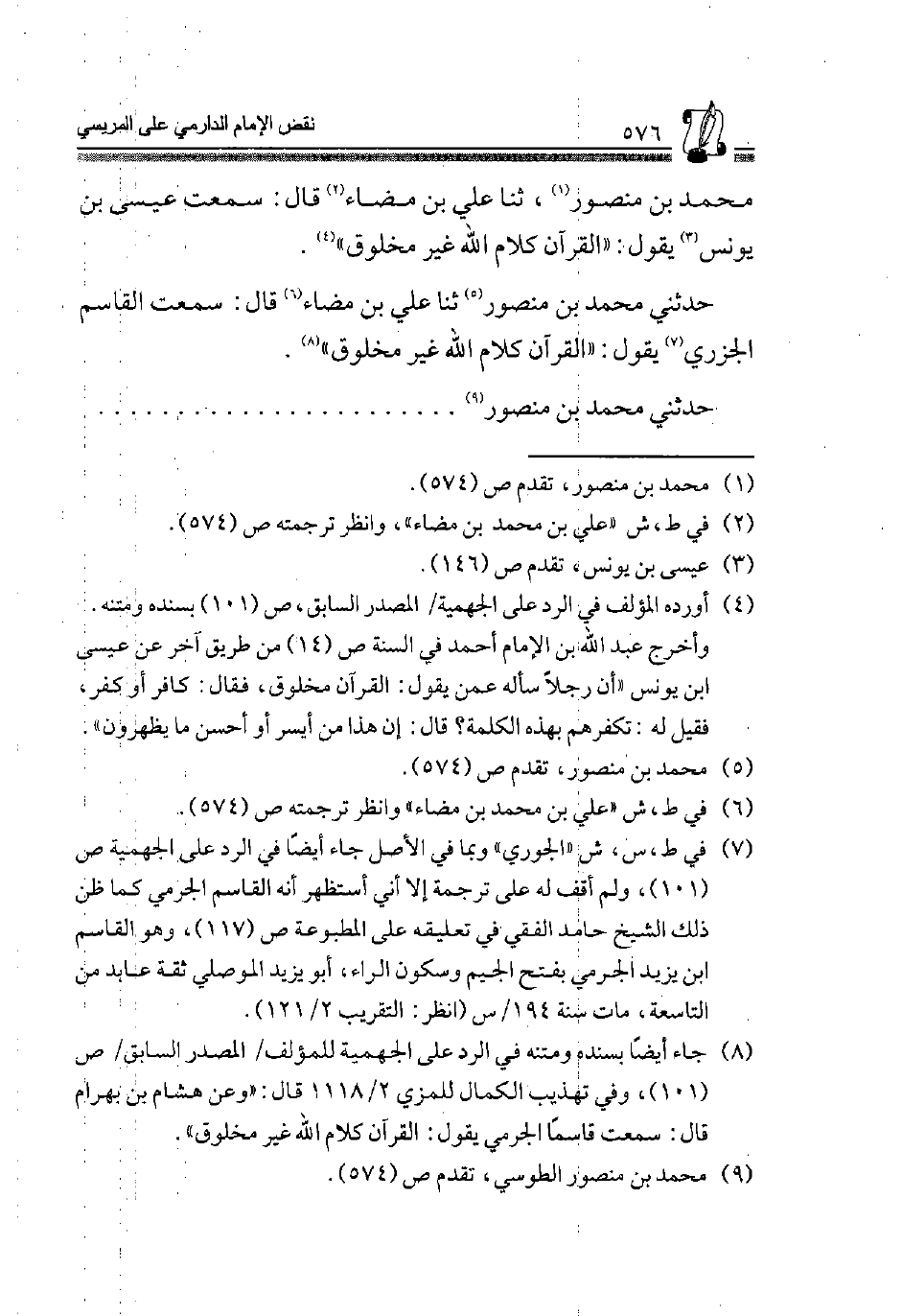 8 جَاءَ أَيْضا بِسَنَدِهِ وَمَتنه فِي الرَّد على الْجَهْمِية للمؤلف، الْمصدر السَّابِق، ص"101"، وَفِي التَّهْذِيب الْكَمَال للمزي 2/ 1118 قَالَ: "وَعَن هِشَامُ بْنُ بِهْرَامٍ قَالَ: سَمِعْتُ قاسمًا الْجرْمِي يَقُولُ: الْقُرْآنُ كَلَامُ اللَّهِ غَيْرُ مَخْلُوق".