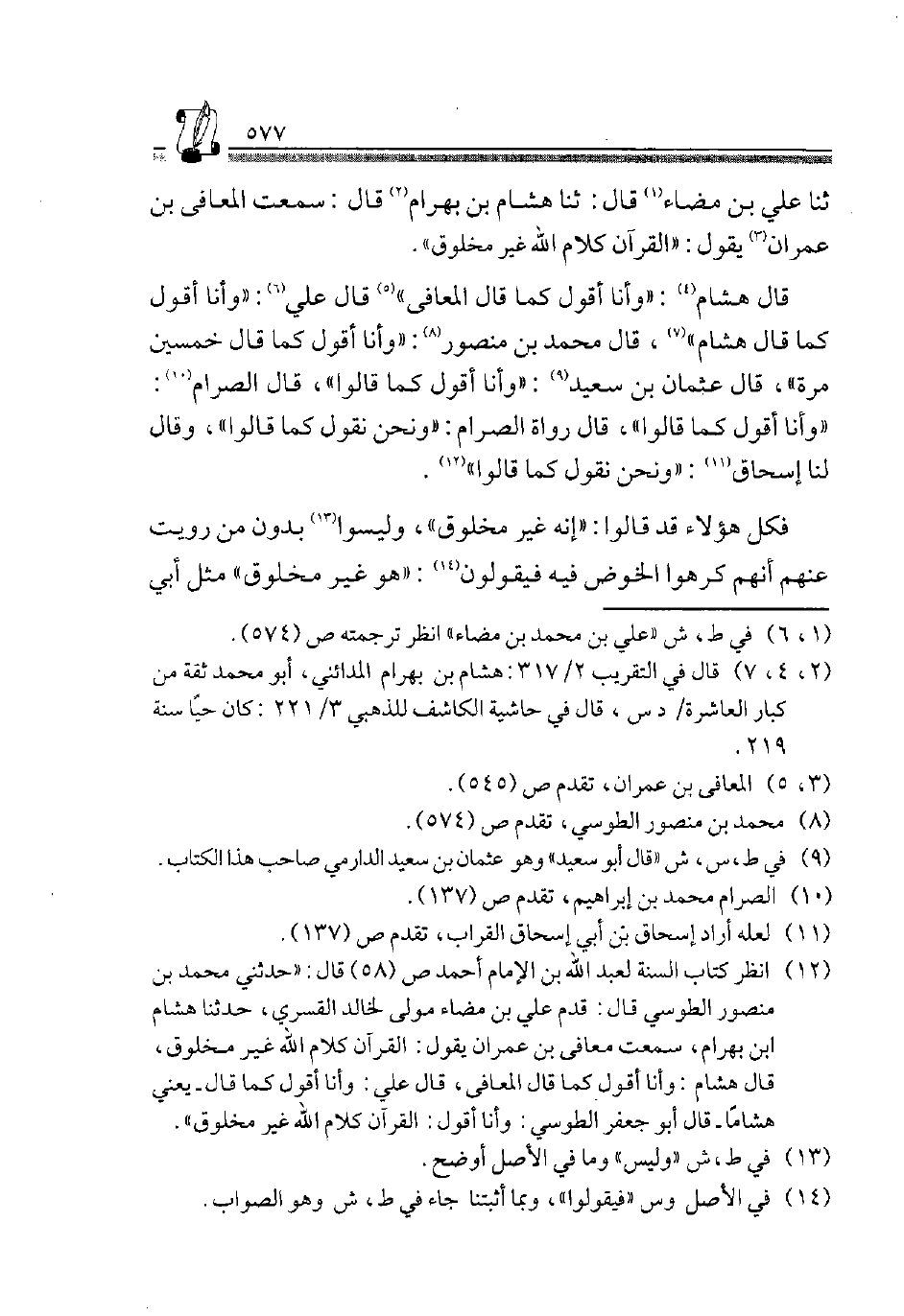 12 انْظُر كتاب السّنة لعبد الله بن الإِمَام أَحْمد ص"58" قَالَ: "حَدَّثَنِي مُحَمَّدُ بْنُ مَنْصُورٍ الطُّوسِيُّ قَالَ: قدم عَليّ بن مضاء مولى لخَالِد الْقَسرِي، حَدثنَا هِشَام بن نهرام، سَمِعت معافى بْنَ عِمْرَانَ يَقُولُ: الْقُرْآنُ كَلَامُ اللَّهِ غَيْرُ مَخْلُوقٍ، قَالَ هِشَامٌ: وَأَنَا أَقُولُ كَمَا قَالَ الْمُعَافَى، قَالَ عَلِيٌّ: وَأَنَا أَقُولُ كَمَا قَالَ -يَعْنِي هشامًا- قَالَ أَبُو جَعْفَر الطوسي: أَنا أَقُول: الْقُرْآنُ كَلَامُ اللَّهِ غَيْرُ مَخْلُوقٍ".