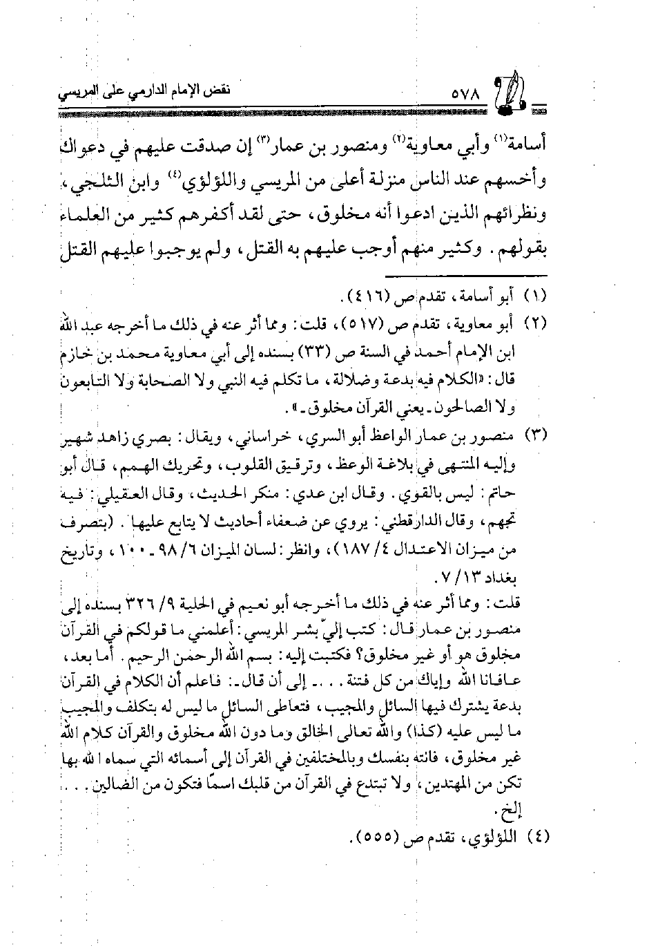 أُسَامَةَ1 وَأَبِي مُعَاوِيَةَ2 وَمَنْصُورِ بْنِ عَمَّارٍ3 إِنْ صَدَقْتَ عَلَيْهِمْ فِي دَعْوَاكَ وَأَخَسُّهُمْ عِنْدَ النَّاسِ مَنْزِلَةً أَعْلَى مِنَ الْمَرِيسِيِّ وَاللُّؤْلُؤِيِّ4 وَابْنِ الثَّلْجِيِّ وَنُظَرَائِهِمُ الَّذِينَ ادَّعَوْا أَنَّهُ مَخْلُوقٌ، حَتَّى لَقَدْ أَكْفَرَهُمْ كَثِيرٌ مِنَ الْعُلَمَاءِ بِقَوْلِهِمْ. وَكَثِيرٌ مِنْهُمْ أَوْجَبَ عَلَيْهِمْ بِهِ الْقَتْلَ، وَلَمْ يُوجِبُوا عَلَيْهِمُ الْقَتْلَ بِذَلِكَ إِلَّا وَأَنَّ قَوْلَهُمْ كَانَ5 عِنْدَهُمْ كُفْرًا.