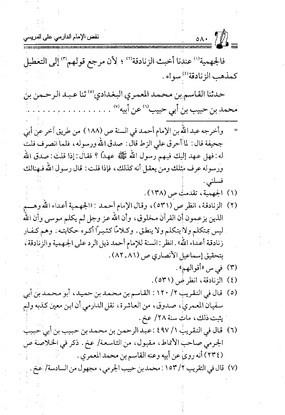 2 الزَّنَادِقَة، انْظُر ص"531"، وَقَالَ الإِمَام أَحْمد: "الْجَهْمِية أَعدَاء الله وهم الَّذين يَزْعمُونَ أَن الْقُرْآن مَخْلُوق، وَأَن الله عز وَجل لم يكلم مُوسَى وَأَن الله لَيْسَ بمتكلم وَلَا يتَكَلَّم ولاينطق وكلامًا كثيرا أكره حكايته. وهم كفار زنادقة أَعدَاء الله". السّنة للْإِمَام أَحْمد ذيل الرَّد على الْجَهْمِية والزنادقة بتحقيق إِسْمَاعِيل الْأنْصَارِيّ ص"81-82".