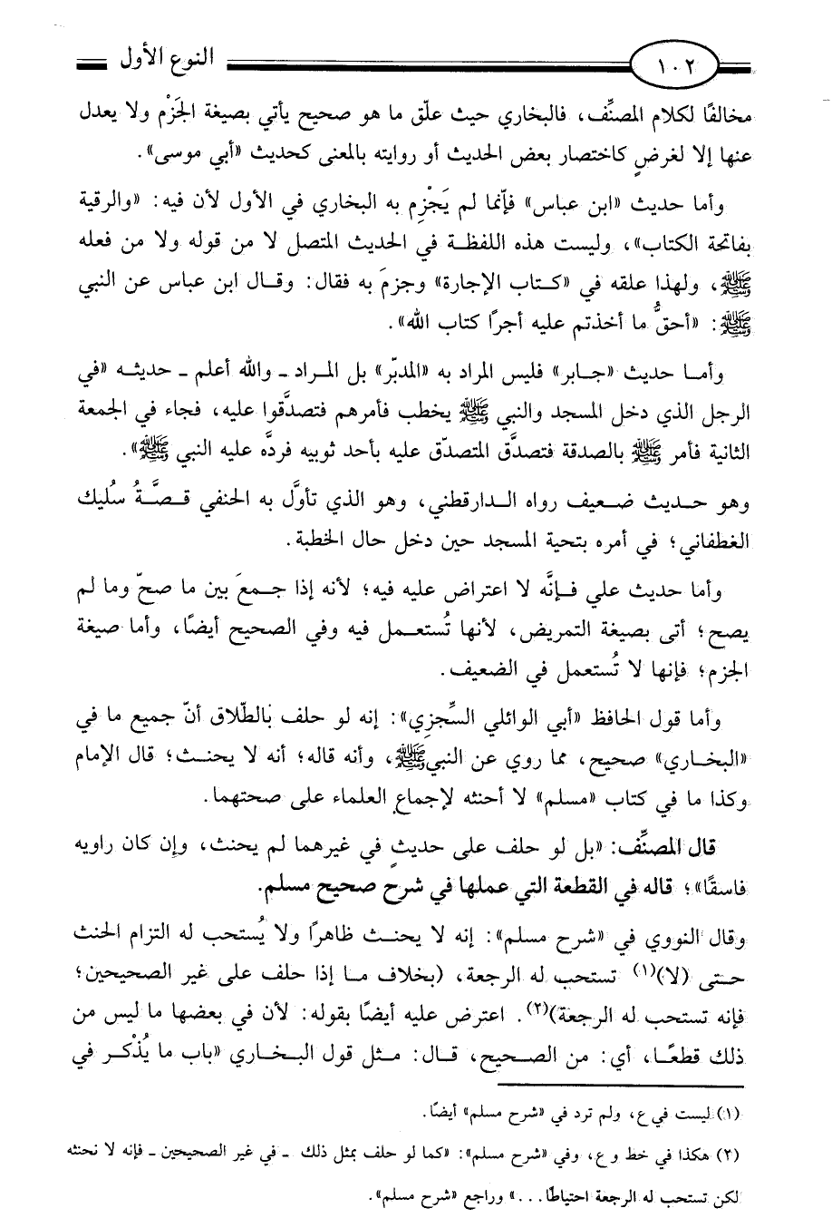 وأما قول الحافظ أبي الوائلي السجزي إنه لو حلف بالطلاق أن جميع ما في البخاري صحيح مما روي عن النبي صلي الله عليه وسلم وأنه قاله إنه لا يحنث قال: الإمام وكذا ما في كتاب مسلم لا أحنثه لإجماع العلماء على صحتهما.
