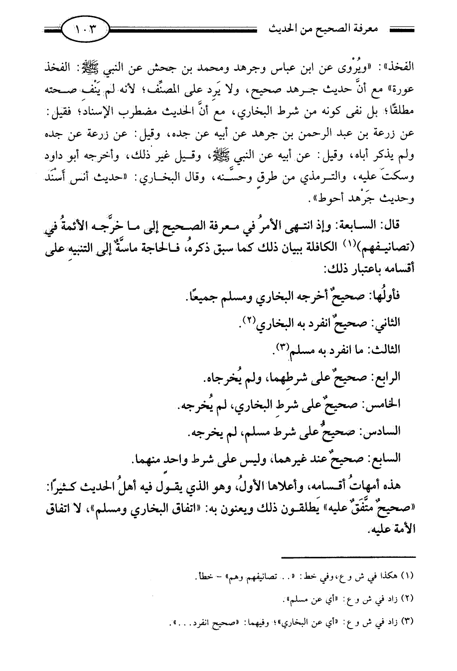 قال السابعة وإذ انتهى الأمر في معرفة الصحيح إلى ما خرجه الأئمة في تصانيفهم1 الكافلة ببيان ذلك كما سبق ذكره فالحاجة ماسة إلى التنبيه على أقسامه باعتبار ذلك.