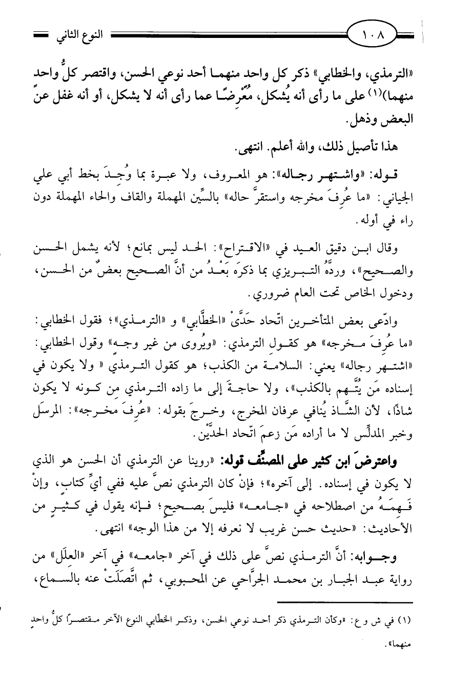 الترمذي والخطابي ذكر كل واحد منهما احد نوعي الحسن واقتصر كل واحد منهما1 على ما رأى أنه يشكل معرضا عما راى أنه لا يشكل أو أنه غفل عن البعض وذهل.