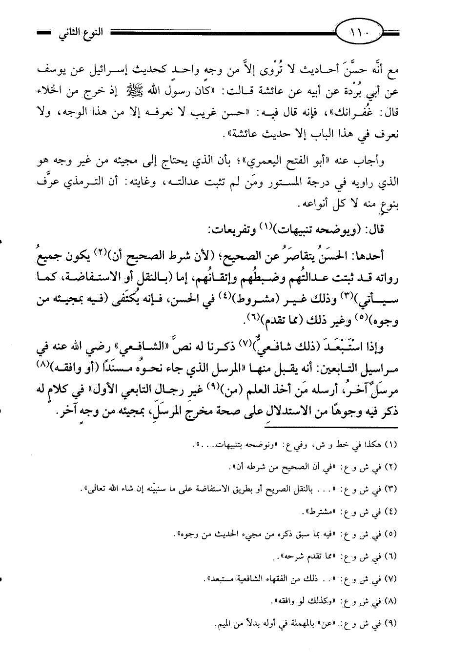 وإذا استبعد ذلك شافعي7 ذكرنا له نص الشافعي رضي الله عنه في مراسيل التابعين أنه يقبل منها المرسل الذي جاء نحوه مسندا أو وافقه8 مرسل آخر أرسله من أخذ العلم من9 غير رجال التابعي الأول في كلام له ذكر فيه وجوها من الاستدلال على صحة مخرج المرسل بمجيئه من وجه آخر.