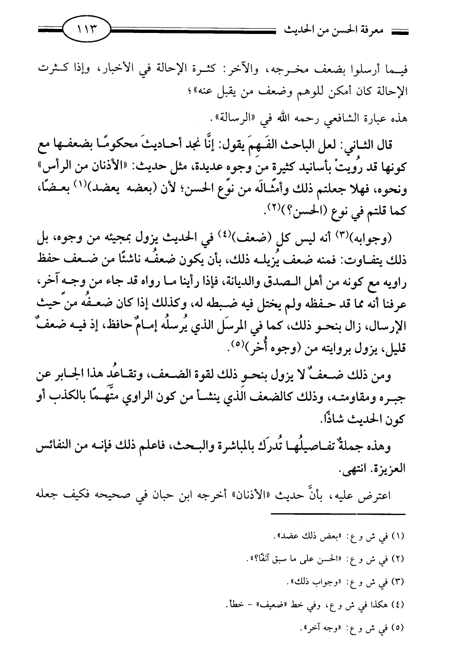 وجوابه3 أنه ليس كل ضعف4 في الحديث يزول بمجيئه من وجوه بل ذلك يتفاوت فمنه ضعف يزيله ذلك بان يكون ضعفه ناشئا من ضعف حفظ راويه مع كونه من أهل الصدق والديانة فإذا رأينا ما رواه قد جاء من وجه آخر عرفنا أنه مما قد حفظه ولم يختل فيه ضبطه له وكذلك إذا كان ضعفه من حيث الإرسال زال بنحو ذلك كما في المرسل الذي يرسله إمام حافظ إذ فيه ضعف قليل يزول بروايته من وجوه أخر5.