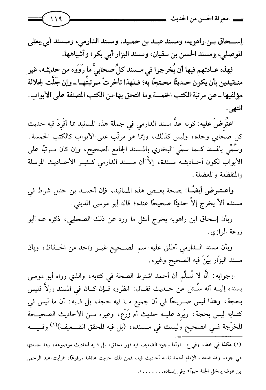 وبأن مسند الدارمي أطلق عليه اسم الصحيح غير واحد من الحفاظ وبأن مسند البزار بين فيه الصحيح وغيره