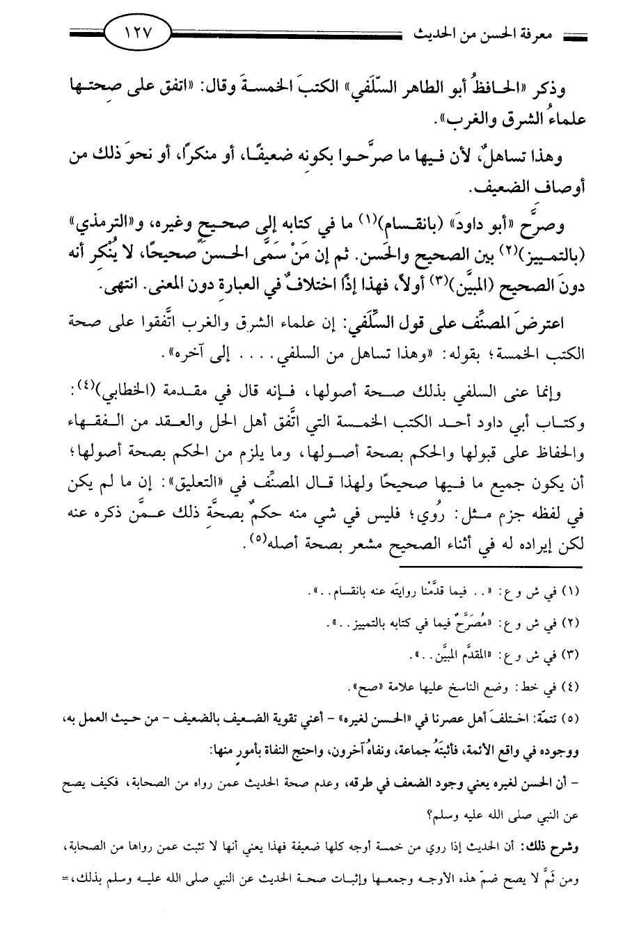 اعترض المصنف على قول السلفي إن علماء الشرق والغرب اتفقوا على صحة الكتب الخمسة بقوله وهذا تساهل من السلفي إلى آخره.