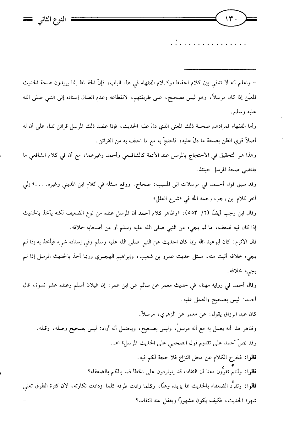 وقال ابن رجب أيضا 2/553 وظاهر كلام أحمد أن المرسل عنده من نوع الضعيف لكنه يأخذ بالحديث إذا كان فيه ضعف ما لم يجيء عن النبي صلى الله عليه وسلم عن أصحابه خلافه.