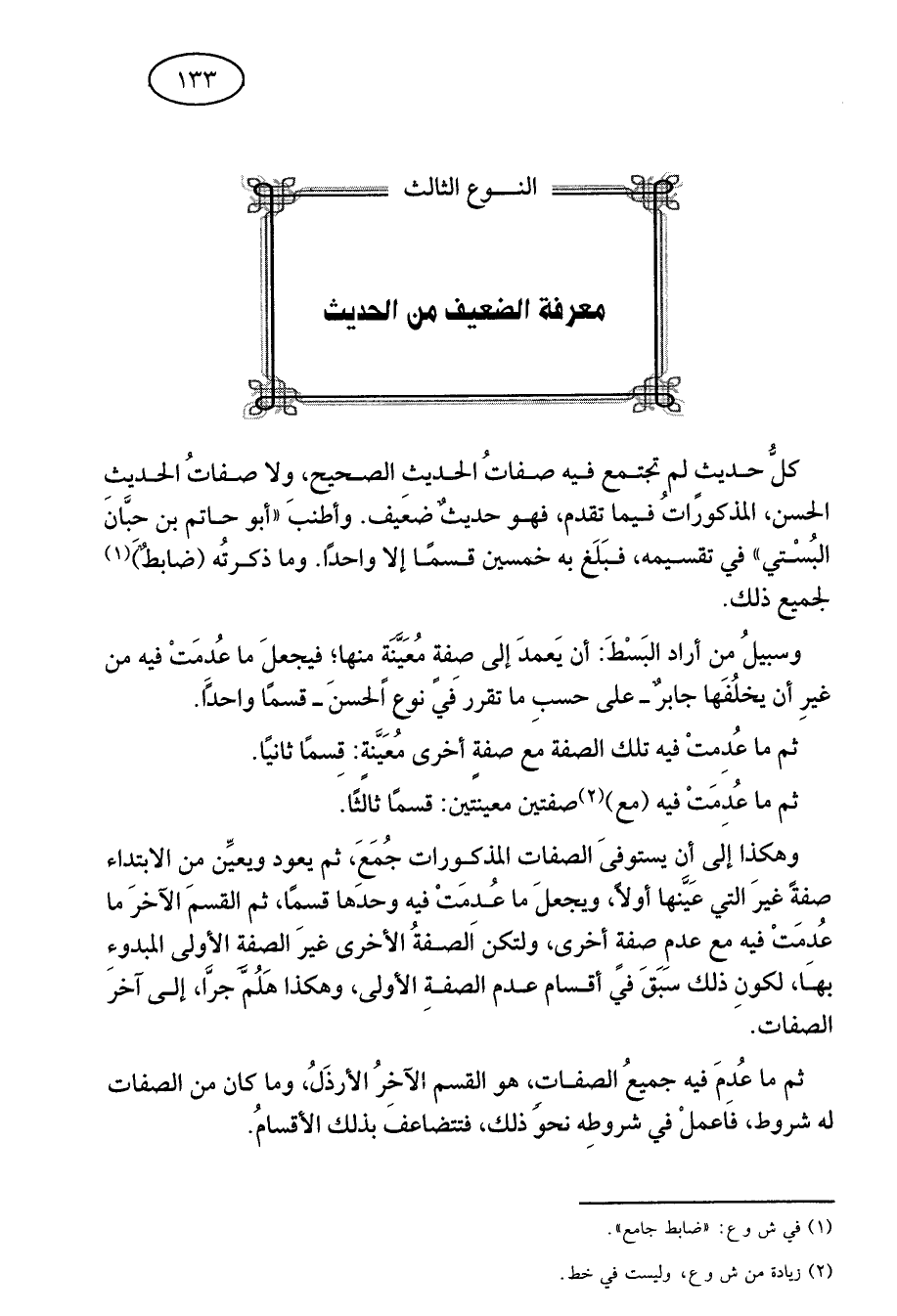 كل حديث لم تجتمع فيه صفات الحديث الصحيح ولا صفات الحديث الحسن المذكورات فيما تقدم فهو حديث ضعيف وأطنب أبو حاتم بن حبان البستي في تقسيمه فبلغ به خمسين قسما إلا واحدا وما ذكرته ضابط1 لجميع ذلك.