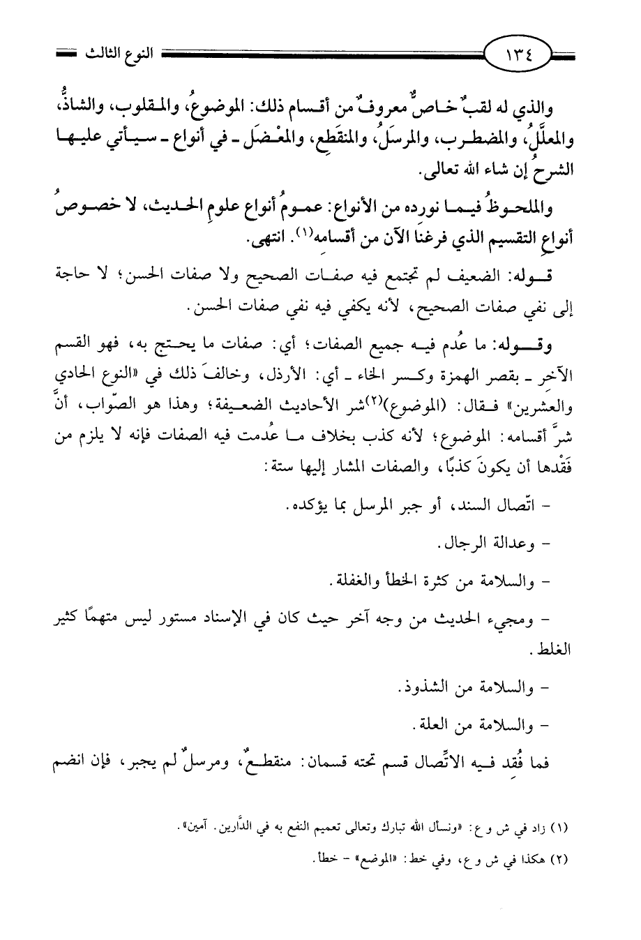 وقوله: ما عدم فيه جميع الصفات أي صفات ما يحتج به فهو القسم الآخر بقصر الهمزة وكسر الخاء أي الأرذل وخالف ذلك في النوع الحادي والعشرين فقال الموضوع2 شر الأحاديث الضعيفة وهذا هو الصواب أن شر أقسامه الموضوع لأنه كذب بخلاف ما عدمت فيه الصفات فإنه لا يلزم من فقدها أن يكون كذبا والصفات المشار إليها ستة.