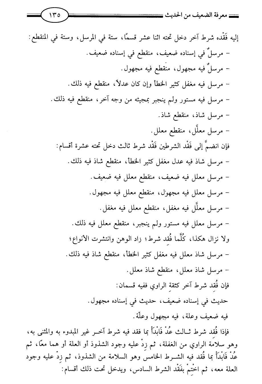 فإذا فقد شرط ثالث عد فابدأ بما فقد فيه شرط آخر غير المبدوء به والمثنى به وهو سلامة الراوي من الغفلة ثم زد عليه وجود الشذوذ أو العلة أو هما معا ثم عد فابدأ بما فقد فيه الشرط الخامس: وهو السلامة من الشذوذ ثم زد عليه وجود العلة معه ثم اختم بفقد الشرط السادس: ويدخل تحت ذلك أقسام: