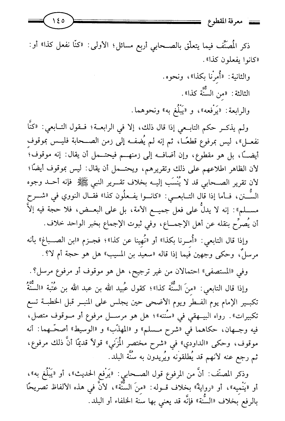 ولم يذكر حكم التابعي إذا قال: ذلك إلا في الرابعة فقول التابعي كنا نفعل ليس بمرفوع قطعا ثم إنه لم يضفه إلى زمن الصحابة فليس بموقوف أيضا بل هو مقطوع وإن أضافه إلى زمنهم فيحتمل أن يقال إنه موقوف لأن الظاهر اطلاعهم على ذلك وتقريرهم ويحتمل أن يقال ليس بموقوف أيضا لأن تقرير الصحابي قد لا ينسب إليه بخلاف تقرير النبي صلى الله عليه وسلم فإنه أحد وجوه السنن فأما إذا قال: التابعي كانوا يفعلون كذا فقال النووي في شرح مسلم إنه لا يدل على فعل جميع الأمة بل على البعض فلا حجة فيه إلا ان يصرح بنقله عن أهل الإجماع وفي ثبوت الإجماع بخبر الواحد خلاف.