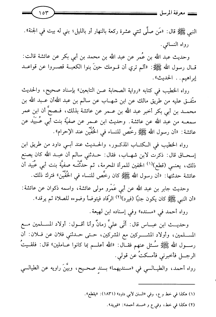 رواه الخطيب في كتابه رواية الصحابة عن التابعين بإسناد صحيح والحديث متفق عليه من طريق مالك عن ابن شهاب عن سالم بن عبد الله أن عبد الله بن محمد بن أبي بكر أخبر عبد الله بن عمر عن عائشة بذلك فصح أن ابن عمر سمعه من عبد الله عن عائشة وحديث ابن عمر عن صفية بنت أبي عبيد عن عائشة أن رسول الله صلى الله عليه وسلم رخص للنساء في الخفين عند الإحرام.