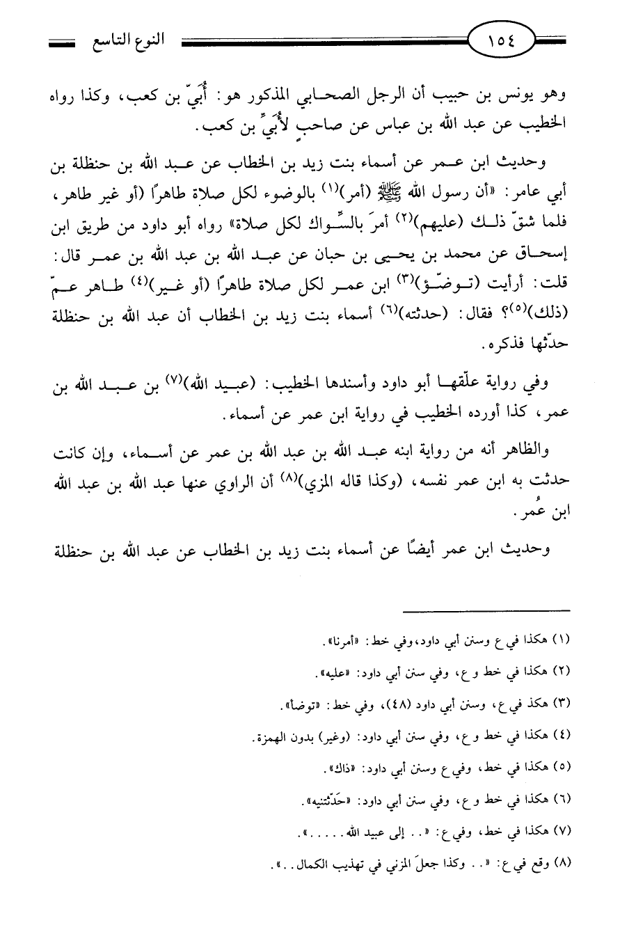 وحديث ابن عمر عن أسماء بنت زيد بن الخطاب عن عبد الله بن حنظلة بن أبي عامر: "ان رسول الله صلى الله عليه وسلم أمر1 بالضوء لكل صلاة طاهرا أو غير طاهر فلما شق ذلك عليهم2 أمر بالسواك لكل صلاة" رواه أبو داود من طريق ابن إسحاق عن محمد بن يحيى بن حبان عن عبد الله بن عبد الله بن عمر قال: قلت أرأيت توضؤ3 ابن عمر لكل صلاة طاهرا أو غير4 طاهر عم ذلك5 فقال حدثته6 أسماء بنت زيد بن الخطاب ان عبد الله بن حنظلة حدثها فذكره.