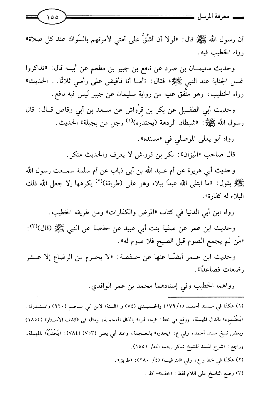 وحديث سليمان بن صرد عن نافع بن جبير بن مطعم عن أبيه قال: تذاكروا غسل الجنابة عند النبي صلي الله عليه وسلم فقال: "أما أنا فأفيض على رأسي ثلاثا ... الحديث" رواه الخطيب وهو متفق عليه من رواية سليمان عن جبير ليس فيه نافع.