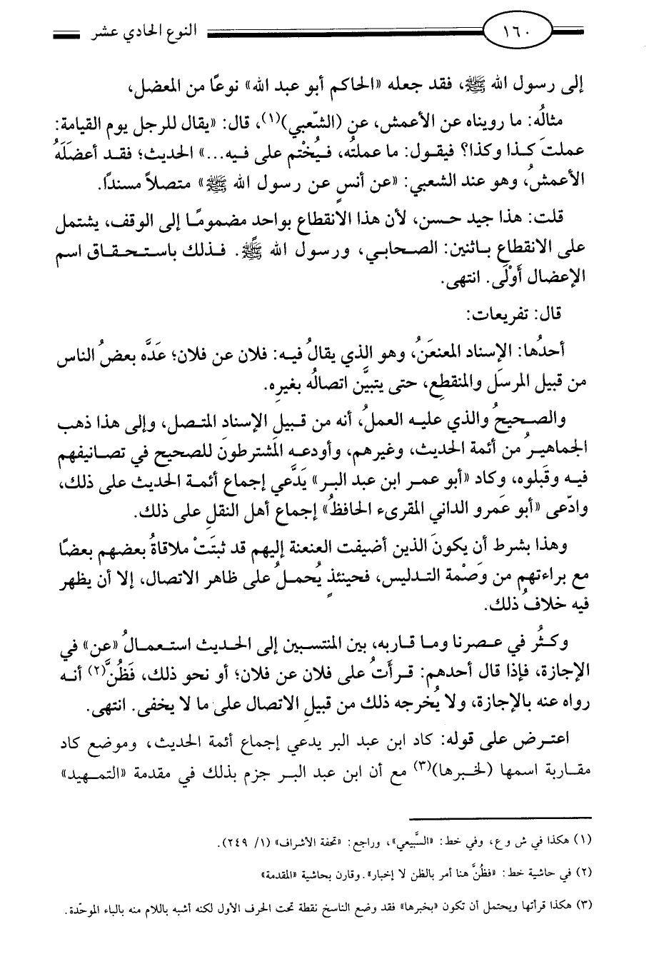 أحدها الإسناد المعنعن وهو الذي يقال فيه فلان عده فلان عدة بعض الناس من قبيل المرسل والمنقطع حتى يتبين اتصاله بغيره.