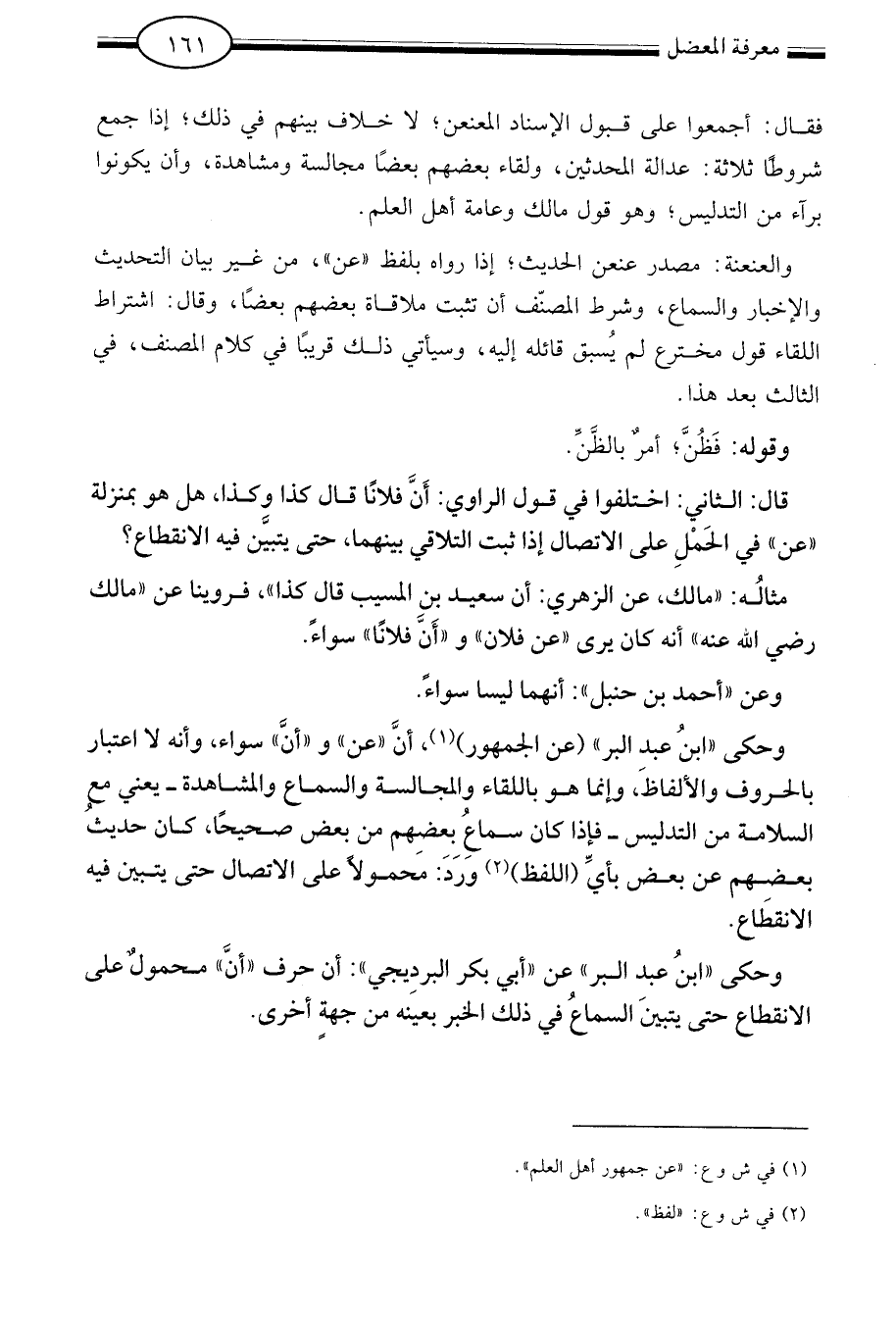 وحكى ابن عبد البر عن الجمهور1 ان عن وأن سواء وأنه لا اعتبار بالحروف والألفاظ وإنما هو باللقاء والمجالسة والسماع والمشاهدة يعني مع السلامة من التدليس فإذا كان سماع بعضهم من بعض صحيحا كان حديث بعضهم عن بعض بأي اللفظ2 ورد محمولا على الاتصال حتى يتبين فيه الانقطاع.