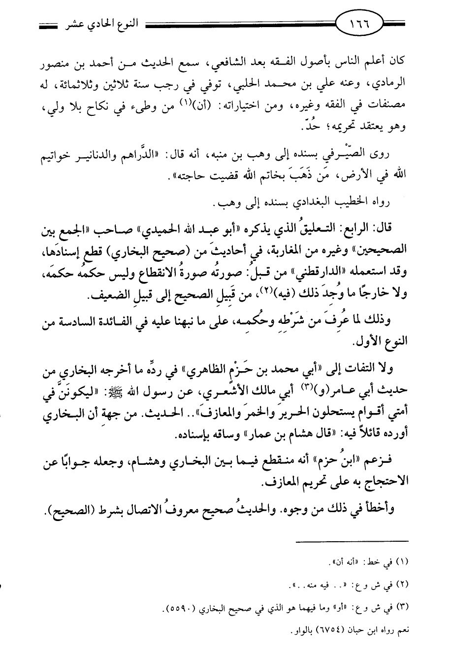 ولا التفات إلى أبي محمد بن حزم الظاهري في رده ما أخرجه البخاري من حديث أبي عامر3 وأبي مالك الأشعري عن رسول الله صلى الله عليه وسلم: "ليكونن في أمتي أقوام يستحلون الحرير والخمر والمعازف" الحديث من جهة ان البخاري أورده قائلا فيه قال: هشام بن عمار وساقه بإسناده.