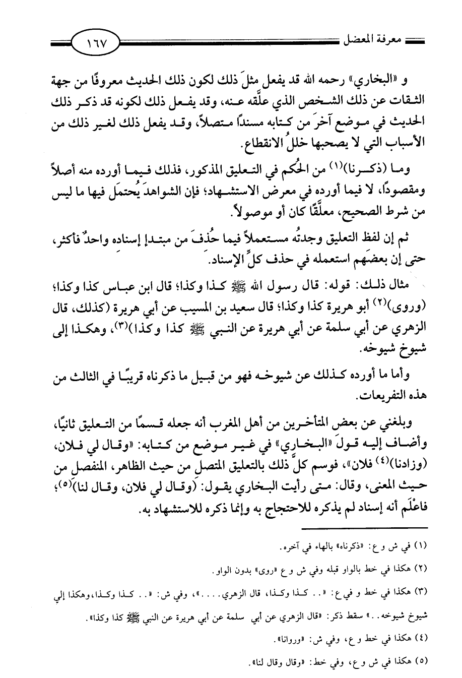 وبلغني عن بعض المتأخرين من أهل المغرب أنه جعله قسما من التعليق ثانيا وأضاف إليه قول البخاري في غير موضع من كتابه وقال لي فلان وزادنا4 فلان فوسم كل ذلك بالتعليق المتصل من حيث الظاهر المنفصل من حيث المعنى وقال متى رأيت البخاري يقول وقال لي فلان وقال لنا5 فاعلم أنه إسناد لم يذكره للاحتجاج به وإنما ذكره للاستشهاد به.