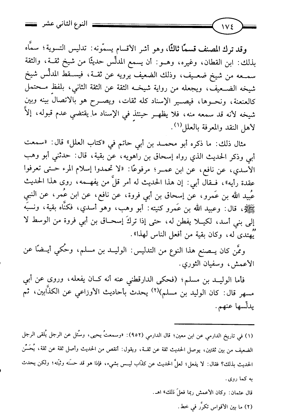 وقد ترك المصنف قسما ثالثا وهو أشر الأقسام يسمونه تدليس التسوية سماه بذلك ابن القطان وغيره وهو ان يسمع المدلس حديثا من شيخ ثقة والثقة سمعه من شيخ ضعيف وذلك الضعيف يرويه عن ثقة فيسقط المدلس شيخ شيخه الضعيف ويجعله من رواية شيخه الثقة عن الثقة الثاني: بلفظ محتمل كالعنعنة ونحوها فيصير الإسناد كله ثقات ويصرح هو بالاتصال بينه وبين شيخه لأنه قد سمعه منه فلا يظهر حينئذ في الإسناد ما يقتضي عدم قبوله إلا لأهل النقد والمعرفة بالعلل1.