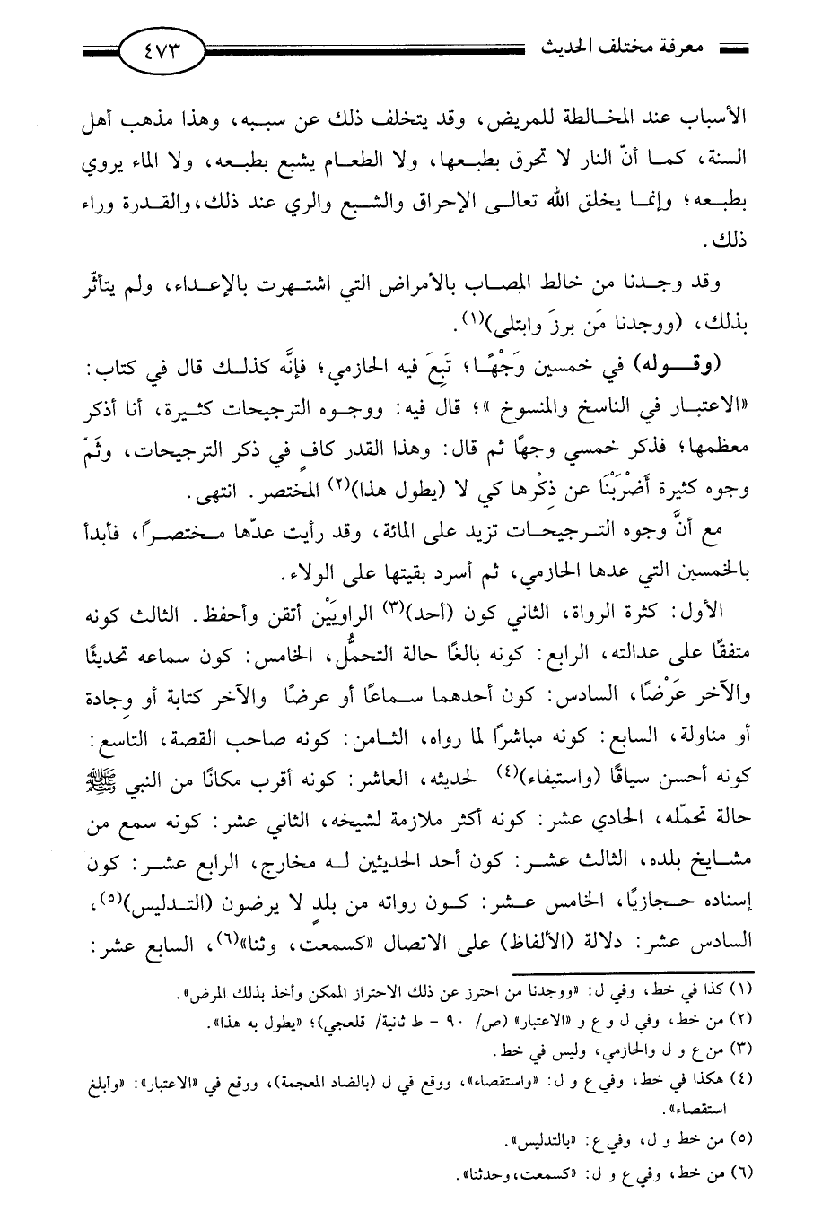 الأول: كثرة الرواة الثاني كون "أحد"3 الروايين أتقن وأحفظ. الثالث كونه متفقا على عدالته الرابع كونه بالغا حالة التحمل الخامس: كون سماعه تحديثا والآخر عرضا السادس: كون أحدهما سماعا أو عرضا والآخر كتابة أو وجادة أو مناولة السابع: كونه مباشرا لما رواه الثامن: كونه صاحب القصة التاسع: كونه أحسن سياقا "واستيفاء"4 لحديثه العاشر: كونه أقرب مكانا من النبي صلى الله عليه وسلم حالة تحمله الحادي عشر: كونه أكثر ملازمة لشيخه الثاني عشر: كونه سمع من مشايخ بلده الثالث عشر: كون أحد الحديثين له مخارج الرابع عشر: كون إسناده حجازيا الخامس عشر: كون رواته من بلد لا يرضون "التدليس"5 السادس عشر: دلالة "الألفاظ" على الاتصال "كسمعت وثنا"6 السابع عشر: