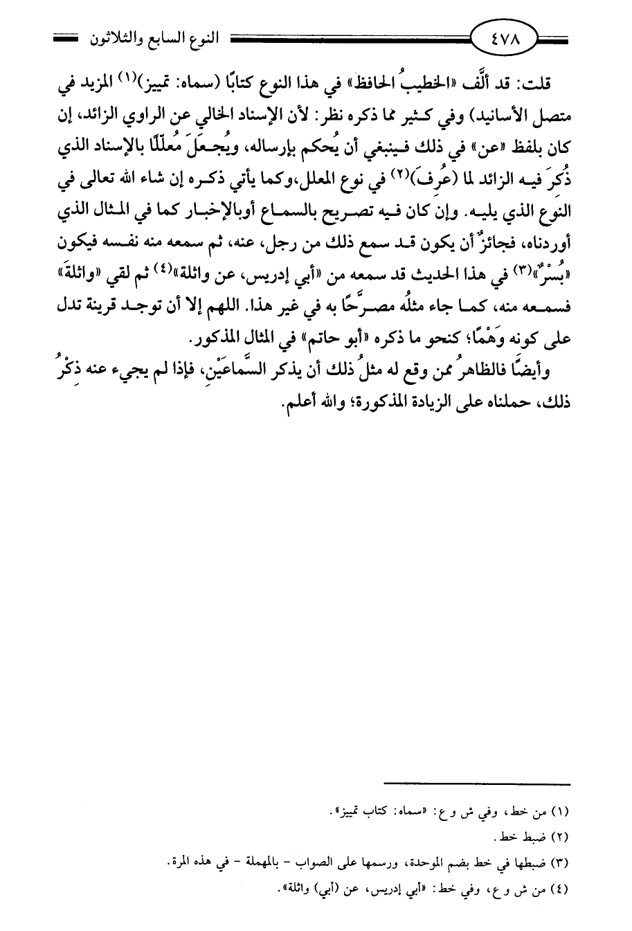 قلت: قد ألف الخطيب الحافظ في هذا النوع كتابا "سماه: تمييز"1 المزيد في متصل الأسانيد وفي كثير مما ذكره نظر: لأن الإسناد الخالي عن الراوي الزائد إن كان بلفظ "عن" في ذلك فينبغي أن يحكم بإرساله ويجعل معللا بالإسناد الذي ذكر فيه الزائد لما "عرف"2 في نوع المعلل وكما يأتي ذكره إن شاء الله تعالى في النوع الذي يليه. وإن كان فيه تصريح بالسماع أو بالإخبار كما في المثال الذي أوردناه فجائز أن يكون قد سمع ذلك من رجل عنه ثم سمعه منه نفسه فيكون "بسر"3 في هذا الحديث قد سمعه من "أبي إدريس عن واثلة"4 ثم لقي واثلة فسمعه منه كما جاء مثله مصرحا به في غير هذا. اللهم إلا أن توجد قرينة تدل على كونه وهما كنحو ما ذكره أبو حاتم في المثال المذكور.