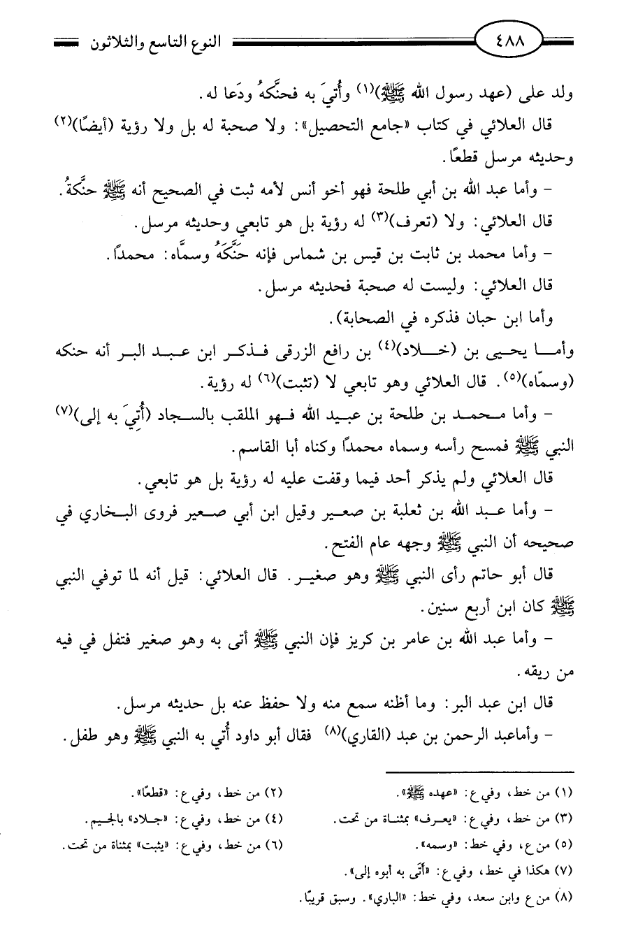 وأما عبد الله بن أبي طلحة فهو أخو أنس لأمه ثبت في الصحيح أنه صلى الله عليه وسلم حنكة قال العلائي ولا "تعرف"3 له رؤية بل هو تابعي وحديثه مرسل. وأما محمد بن ثابت بن قيس بن شماس فإنه حنكه وسماه محمدا قال العلائي وليست له صحبة فحديثه مرسل.
