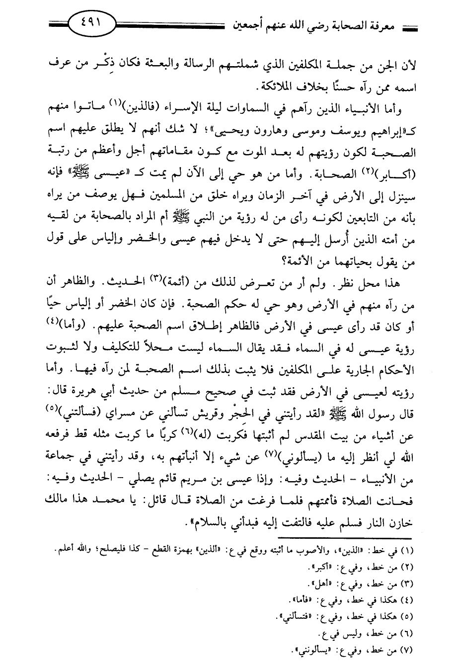 وأما الأنبياء الذين رآهم في السماوات ليلة الإسراء "فالذين"1 ماتوا منهم كإبراهيم ويوسف وموسى وهارون ويحيى لا شك أنهم لا يطلق عليهم اسم الصحبة لكون رؤيتهم له بعد الموت مع كون مقاماتهم أجل وأعظم من رتبة "أكابر"2 الصحابة. وأما من هو حي إلى الآن لم يمت عيسى صلى الله عليه وسلم فإنه سينزل إلى الأرض في آخر الزمان ويراه خلق من المسلمين فهل يوصف من يراه بأنه من التابعين لكونه رأى من له رؤية من النبي صلى الله عليه وسلم أم المراد بالصحابة من لقيه من أمته الذين أرسل إليهم حتى لا يدخل فيهم عيسى والخضر وإلياس على قول من يقول بحياتهما من الأئمة؟