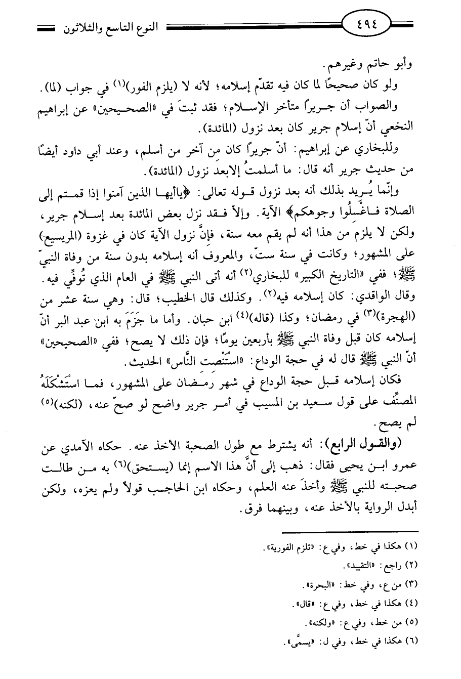 "والقول الرابع" أنه يشترط مع طول الصحبة الأخذ عنه حكاه الآمدي عن عمرو ابن يحيى فقال ذهب إلى أن هذا الاسم إنما "يستحق"6 به من طالت صحبته للنبي صلى الله عليه وسلم وأخذ عنه العلم وحكاه ابن الحاجب قولا ولم يعزه ولكن أبدل الرواية بالأخذ عنه وبينهما فرق.