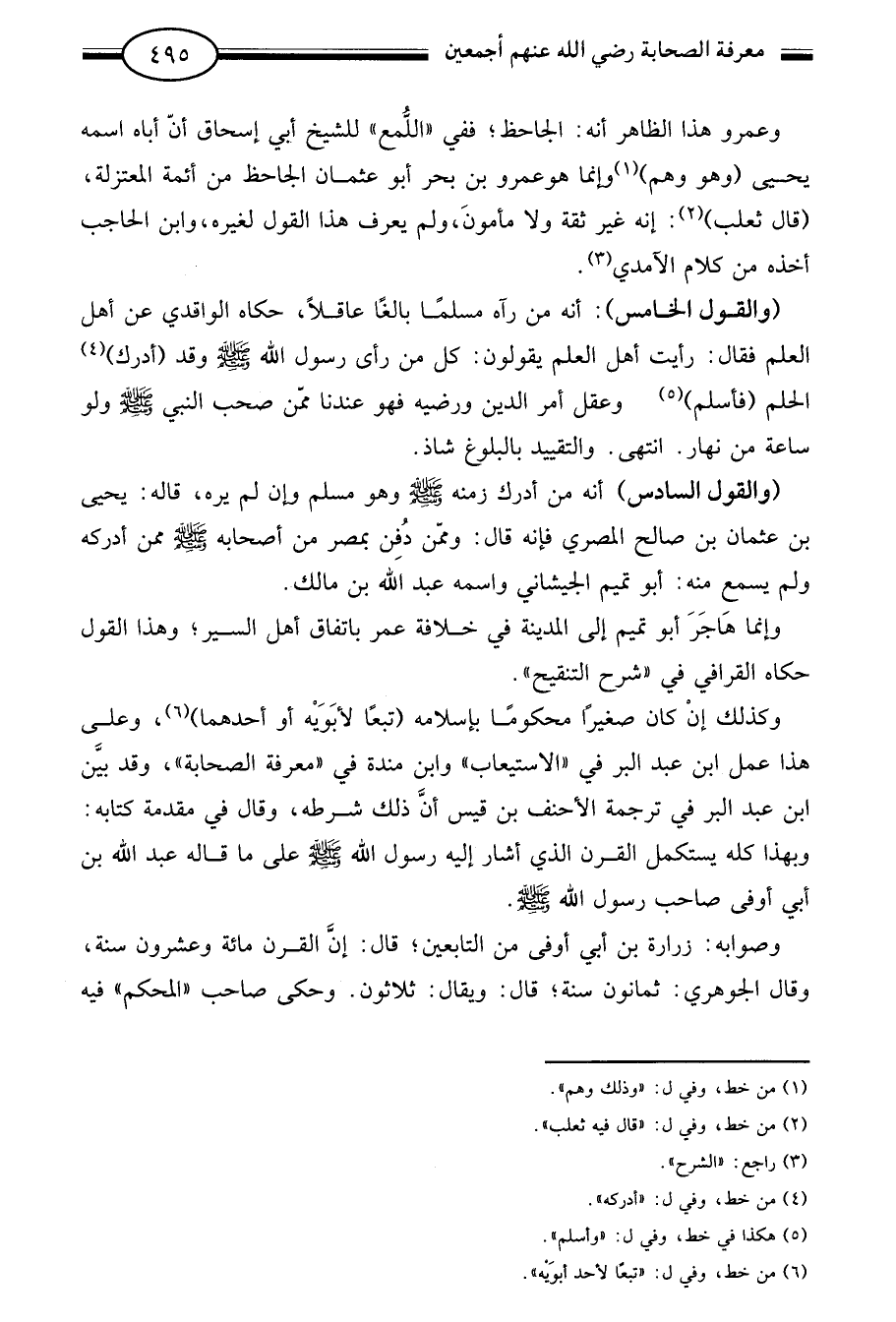 "والقول الخامس": أنه من رآه مسلما بالغا عاقلا حكاه الواقدي عن أهل العلم فقال رأيت أهل العلم يقولون كل من رأى رسول الله صلى الله عليه وسلم وقد "أدرك"4 الحلم "فأسلم"5 وعقل أمر الدين ورضيه فهو عندنا ممن صحب النبي صلى الله عليه وسلم ولو ساعة من نهار انتهى. والتقييد بالبلوغ شاذ