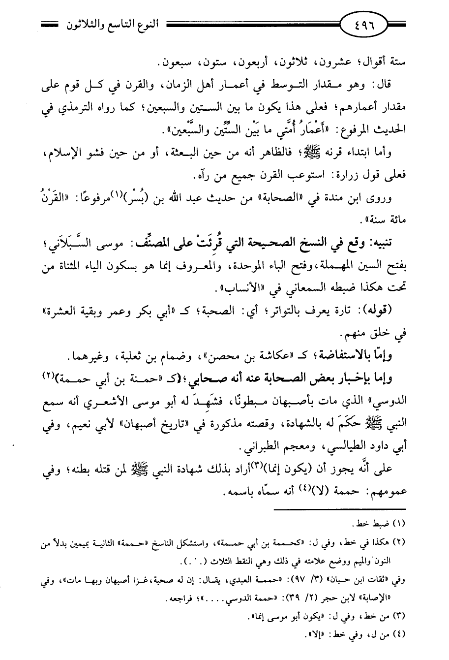 وإما بإخبار بعض الصحابة عنه أنه صحابي "كـ "حمنة بن أبي حممة"2 الدوسي" الذي مات بأصبهان مبطونا فشهد له أبو موسى الأشعري أنه سمع النبي صلى الله عليه وسلم حكم له بالشهادة وقصته مذكورة في "تاريخ أصبهان" لأبي نعيم وفي أبي داود الطيالسي ومعجم الطبراني.