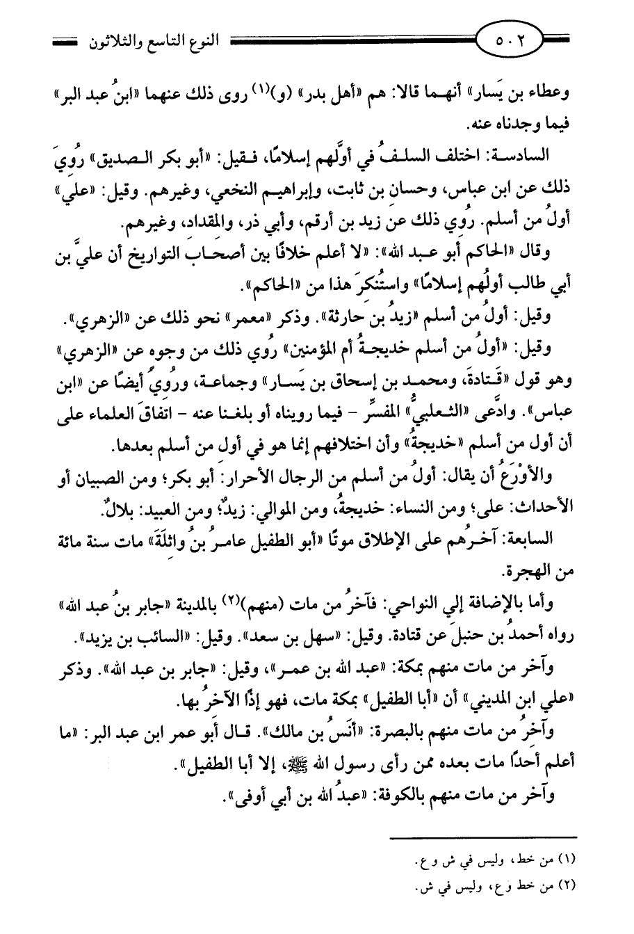 السابعة: آخرهم على الإطلاق موتا أبو الطفيل عامر بن واثلة مات سنة مائة من الهجرة. وأما بالإضافة إلي النواحي فآخر من مات "منهم"2 بالمدينة جابر بن عبد الله رواه أحمد بن حنبل عن قتادة وقيل سهل بن سعد وقيل السائب بن يزيد.