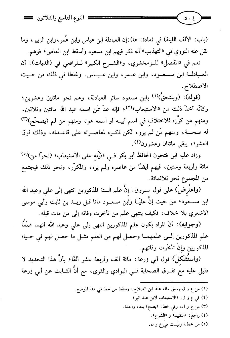 قوله: "ويلتحق"1 بابن مسعود سائر العبادلة وهم نحو مائتين وعشرين وكأنه أخذ ذلك من "الاستيعاب "2فإنه عد ممن اسمه عبد الله مائتين وثلاثين ومنهم من كرره للاختلاف في اسم أبيه أو اسمه هو ومنهم من لم "يصحح"3 له صحبه ومنهم من لم يرو لكن ذكره لمعاصرته على قاعدته وذلك فوق العشرة يبقى مائتان وعشرون4