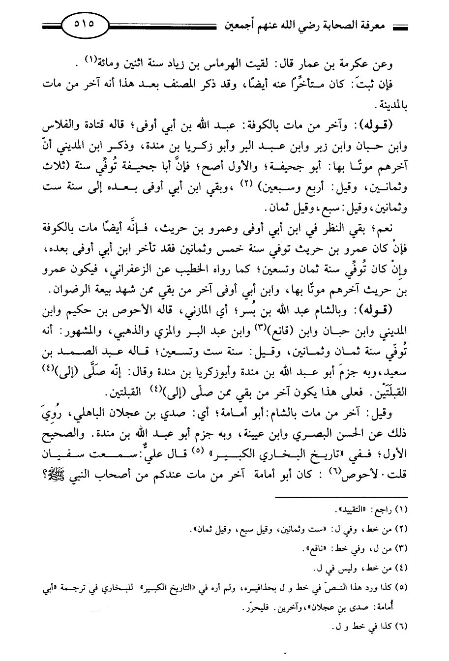 نعم بقي النظر في ابن أبي أوفى وعمرو بن حريث فإنه أيضا مات بالكوفة فإن كان عمرو بن حريث توفي سنة خمس وثمانين فقد تأخر ابن أبي أوفى بعده وإن كان توفي سنة ثمان وتسعين كما رواه الخطيب عن الزعفراني فيكون عمرو بن حريث آخرهم موتا بها وابن أبي أوفى آخر من بقي ممن شهد بيعة الرضوان.