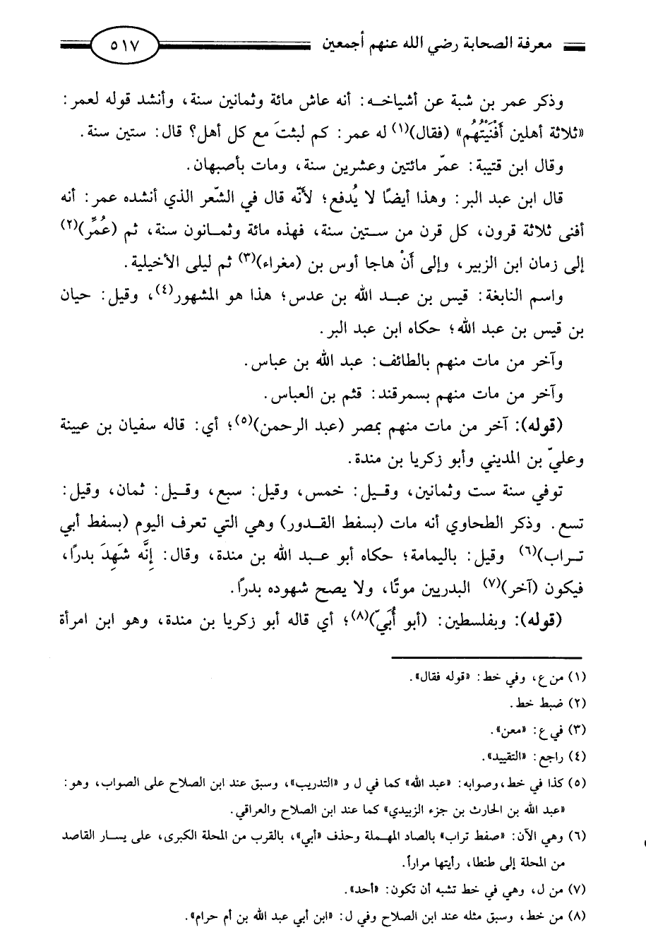 قال ابن عبد البر: وهذا أيضا لا يدفع لأنه قال في الشعر الذي أنشده عمر أنه أفنى ثلاثة قرون كل قرن من ستين سنة فهذه مائة وثمانون سنة ثم "عمر"2 إلى زمان ابن الزبير وإلى أن هاجا أوس بن "مغراء"3 ثم ليلى الأخيلية.