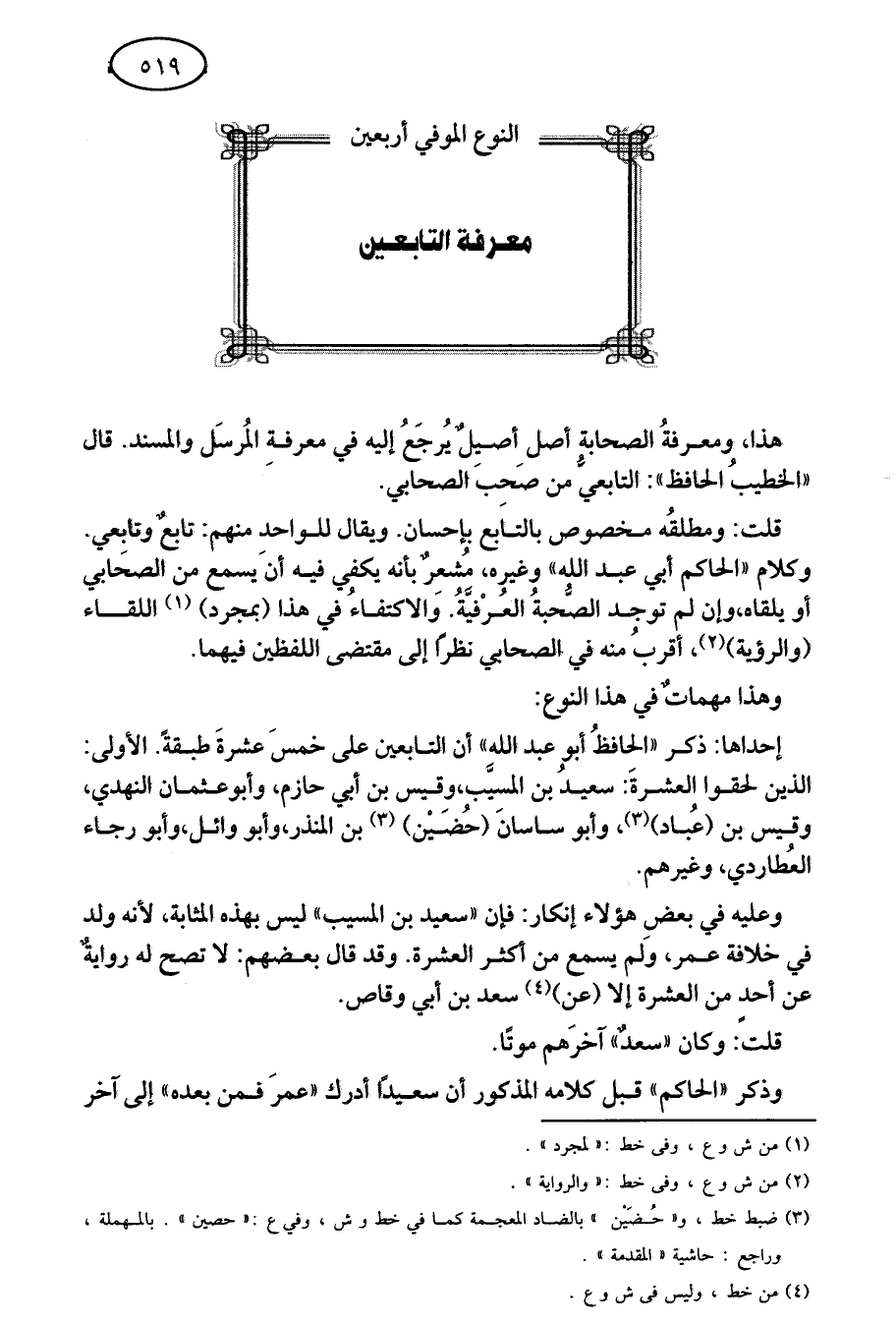 هذا ومعرفة الصحابة أصل أصيل يرجع إليه في معرفة المرسل والمسند قال "الخطيب الحافظ": التابعي من صحب الصحابي.