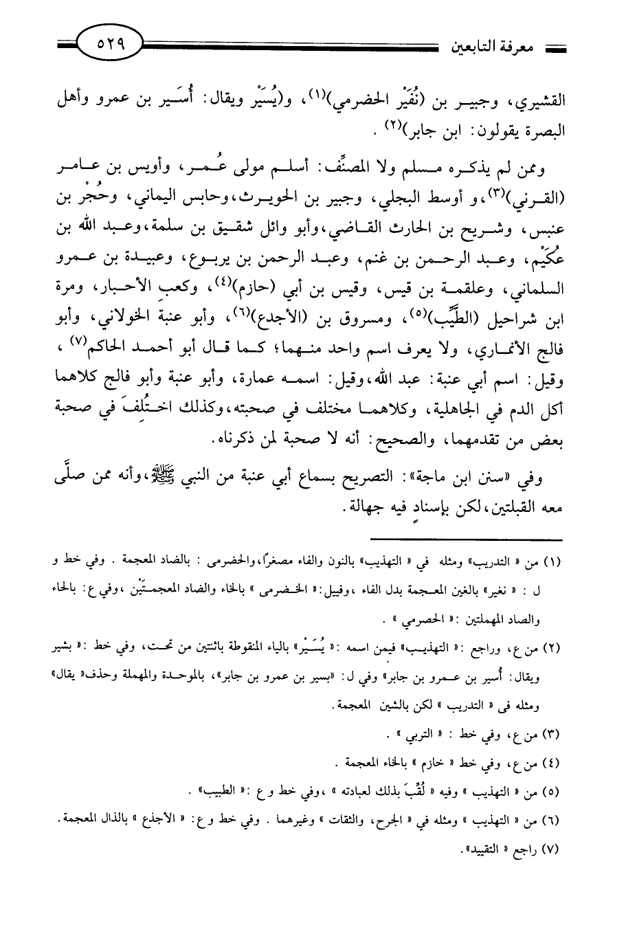 القشيري وجبير بن "نفير الحضرمي"1 و"يسير ويقال: أسير بن عمرو وأهل البصرة يقولون ابن جابر"2.