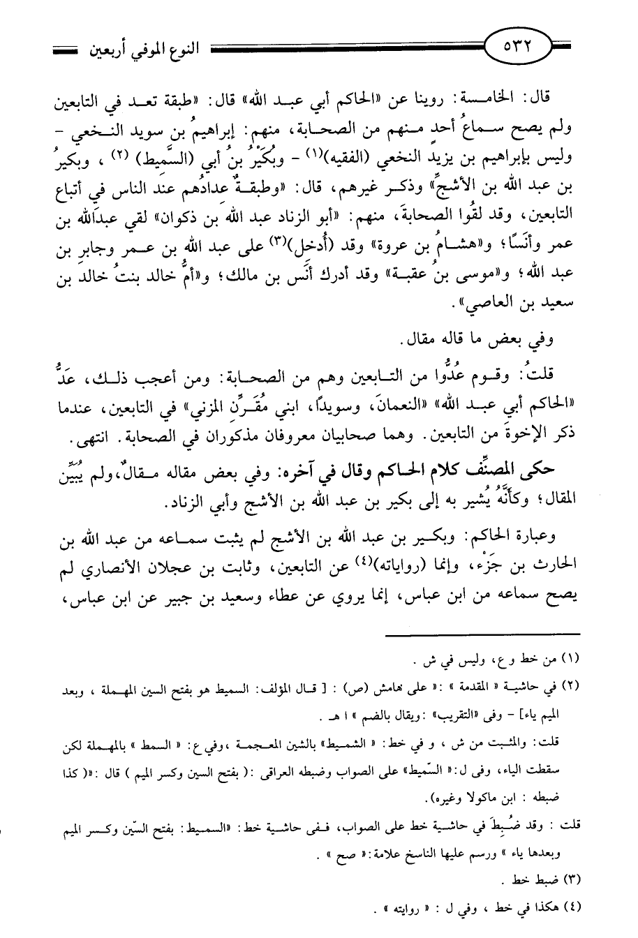 قال: الخامسة: روينا عن "الحاكم أبي عبد الله" قال: "طبقة تعد في التابعين ولم يصح سماع أحد منهم من الصحابة منهم إبراهيم بن سويد النخعي وليس بإبراهيم بن يزيد النخعي "الفقيه"1 وبكير بن أبي "السميط"2 وبكير بن عبد الله بن الأشج" وذكر غيرهم قال: "وطبقة عدادهم عند الناس في أتباع التابعين وقد لقوا الصحابة منهم: "أبو الزناد عبد الله بن ذكوان" لقي عبد الله بن عمر وأنسا وهشام بن عروة وقد "أدخل"3 على عبد الله بن عمر وجابر بن عبد الله وموسى بن عقبة وقد أدرك أنس بن مالك وأم خالد بنت خالد بن سعيد بن العاصي.