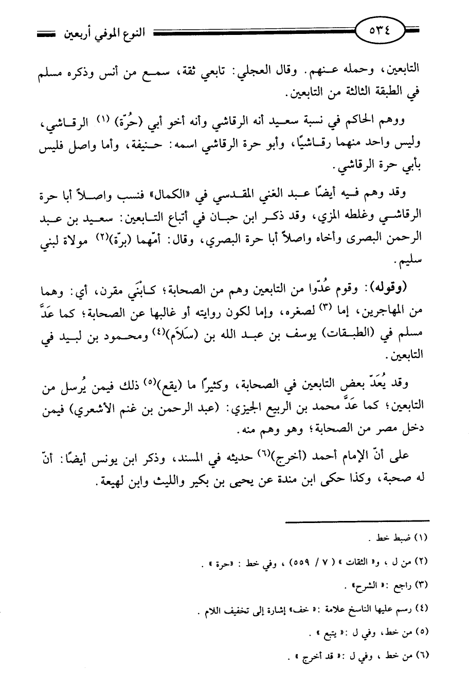 وقد يعد بعض التابعين في الصحابة وكثيرا ما "يقع"5 ذلك فيمن يرسل من التابعين كما عد محمد بن الربيع الجيزي "عبد الرحمن بن غنم الأشعري" فيمن دخل مصر من الصحابة وهو وهم منه.