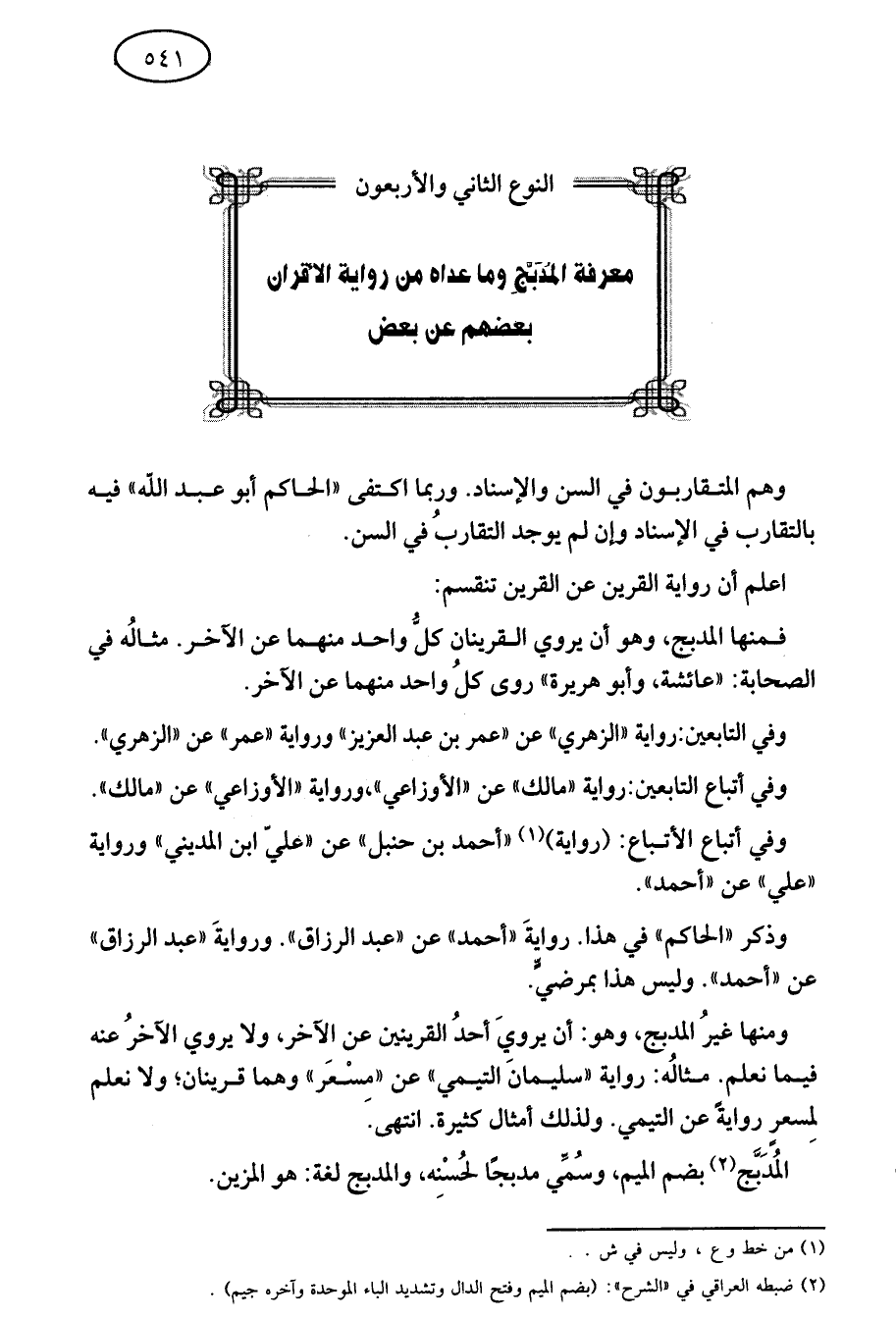 ومنها غير المدبج وهو: أن يروي أحد القرينين عن الآخر ولا يروي الآخر عنه فيما نعلم مثاله رواية سليمان التيمي عن مسعر وهما قرينان ولا نعلم لمسعر رواية عن التيمي ولذلك أمثال كثيرة انتهى.