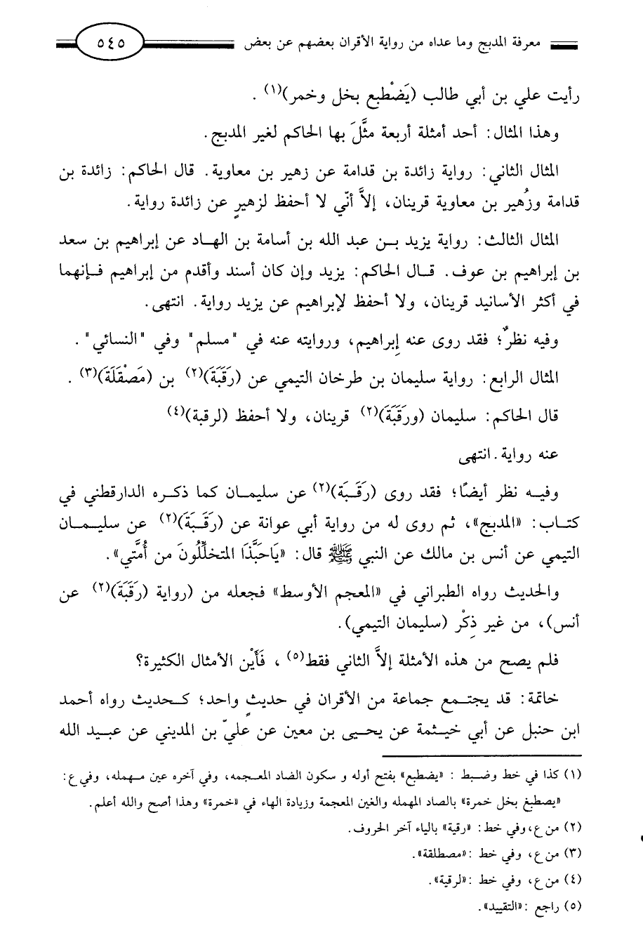 وفيه نظر أيضا فقد روى رقبة"2" عن سليمان كما ذكره الدارقطني في كتاب المدبج ثم روى له من رواية أبي عوانة عن رقبة"2" عن سليمان التيمي عن أنس بن مالك عن النبي صلى الله عليه وسلم قال: "يا حبذا المتخللون من أمتي".