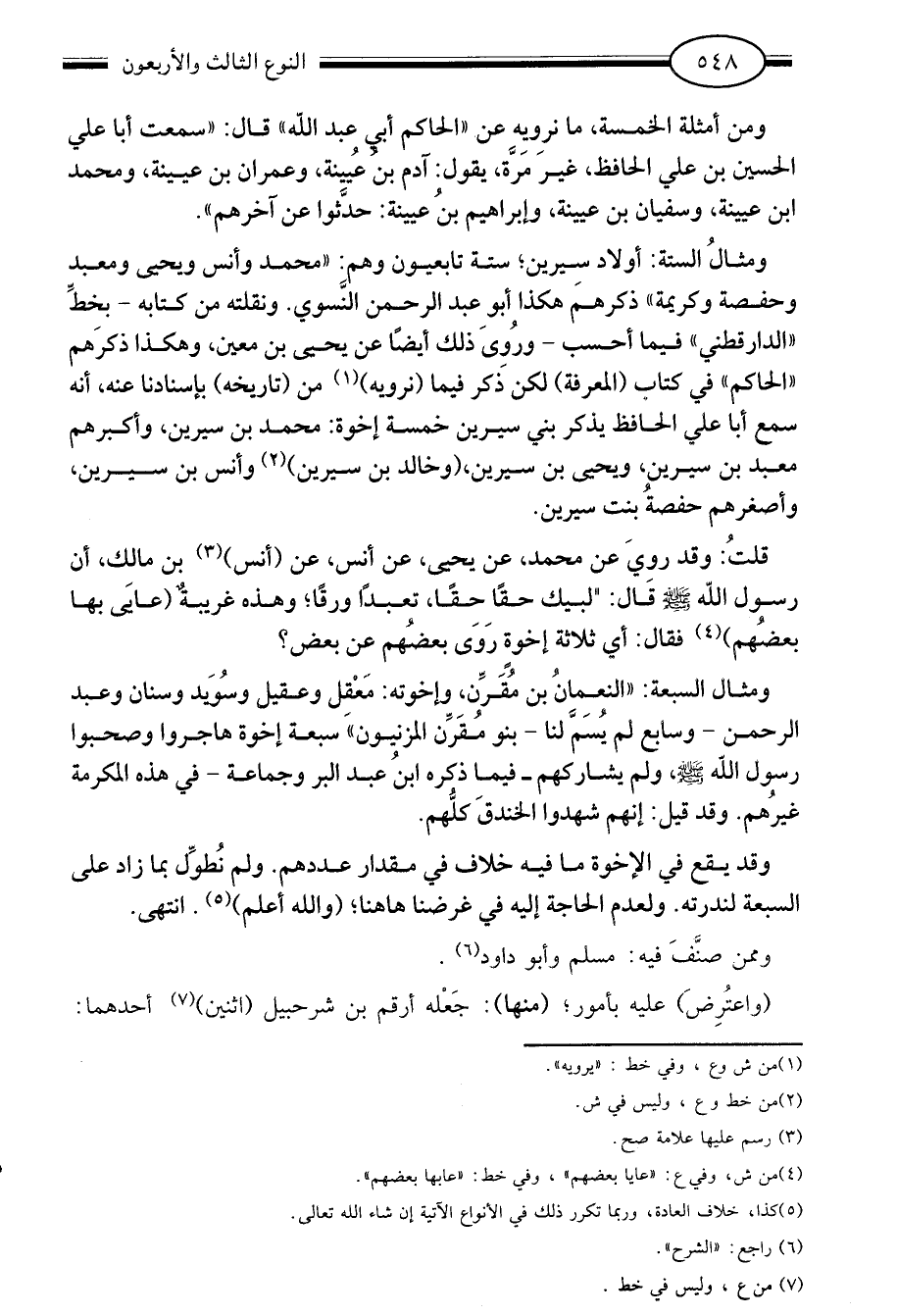 ومثال الستة: أولاد سيرين ستة تابعيون وهم محمد وأنس ويحيى ومعبد وحفصة وكريمة ذكرهم هكذا أبو عبد الرحمن النسوي ونقلته من كتابه بخط الدارقطني فيما أحسب وروى ذلك أيضا عن يحيى بن معين وهكذا ذكرهم الحاكم في كتاب المعرفة لكن ذكر فيما "نرويه"1 من تاريخه بإسنادنا عنه أنه سمع أبا علي الحافظ يذكر بني سيرين خمسة إخوة محمد بن سيرين وأكبرهم معبد بن سيرين ويحيى بن سيرين "وخالد بن سيرين"2 وأنس بن سيرين وأصغرهم حفصة بنت سيرين.