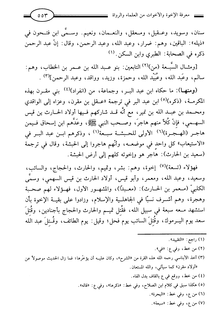 "ومنها": ما حكاه ابن عبد البر وجماعة من "انفراد"4 بني مقرن بهذه المكرمة "ذكره"5 ابن عبد البر في ترجمة عقل بن مقرن وعزاه إلى الواقدي ومحمد بن عبد الله بن نمير مع أنه قد شاركهم فيها أولاد الحارث بن قيس السهمي فإن كلا منهم هاجر وصحب النبي صلى الله عليه وسلم وعدهم ابن إسحاق فيمن هاجر "الهجرة"6 الأولى للحبشة سبعة"1" وذكرهم ابن عبد البر في الاستيعاب كل واحد في موضعه وأنهم هاجروا إلى الحبشة وقال في ترجمة سعيد بن الحارث هاجر هو وإخوته كلهم إلى أرض الحبشة.