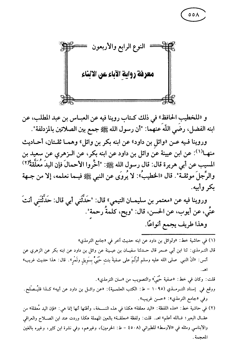 وروينا فيه عن "وائل بن داود" عن ابنه بكر بن وائل" وهما ثقتان أحاديث منها1: عن ابن عيينة عن وائل بن داود عن ابنه بكر عن الزهري عن سعيد بن المسيب عن أبي هريرة قال: قال رسول الله صلى الله عليه وسلم "أخروا الأحمال فإن اليد معلقة2 والرجل موثقة". قال "الخطيب": لا يروى عن النبي صلى الله عليه وسلم فيما نعلمه إلا من جهة بكر وأبيه.